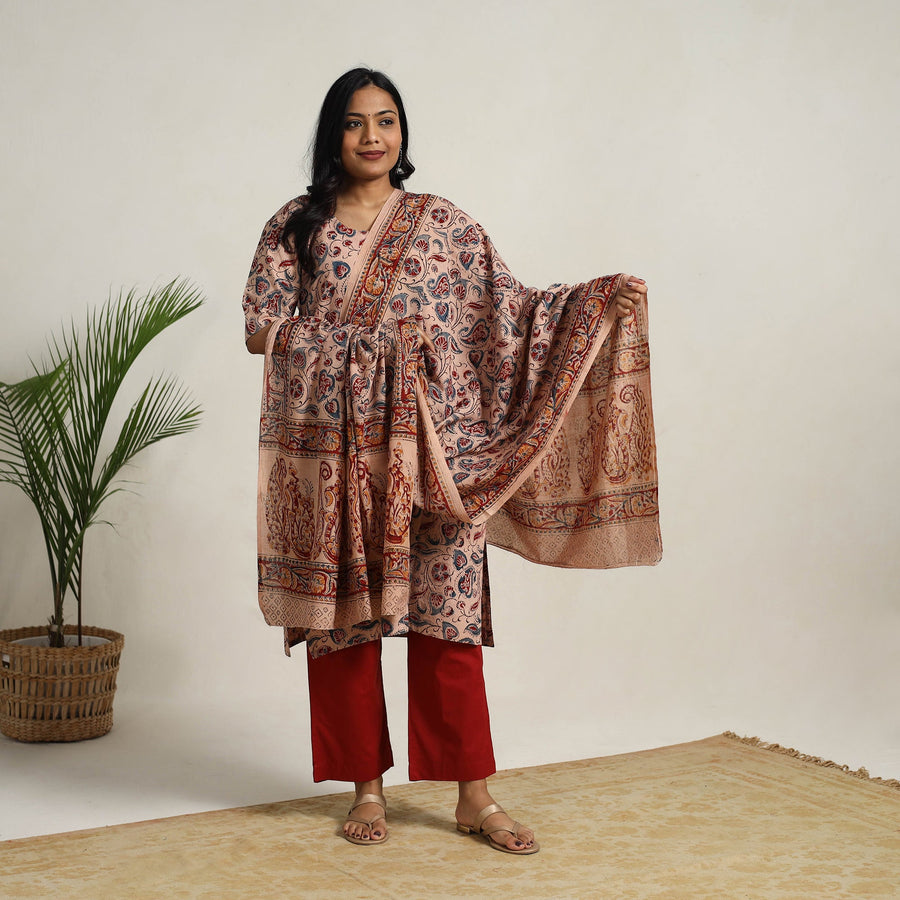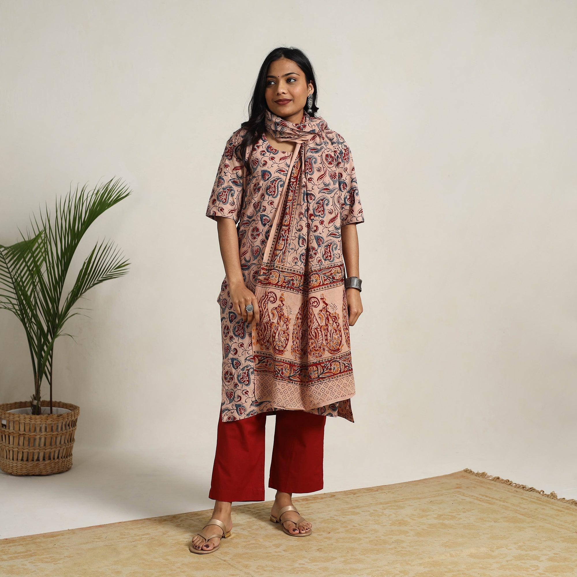 Step into the timeless elegance of tradition with beige block printed cotton kalamkari kurta set. This curated set features a cotton kurta, palazzo, and a coordinating dupatta all meticulously handcrafted by skilled artisans. With pockets for practicality and soft, breathable cotton for all-day comfort, it's a wardrobe essential for casual outings or festive moments.