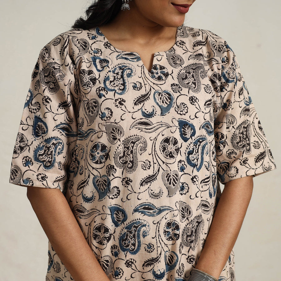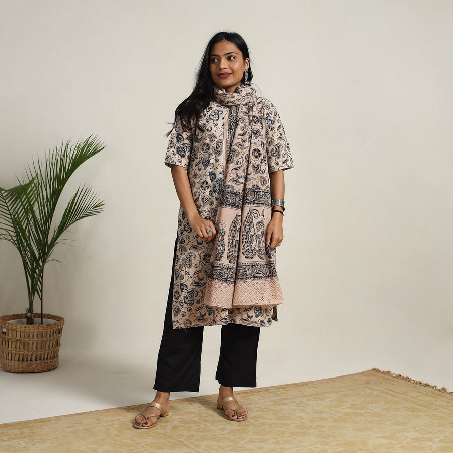 Step into the timeless elegance of tradition with beige block printed cotton kalamkari kurta set. This curated set features a cotton kurta, palazzo, and a coordinating dupatta all meticulously handcrafted by skilled artisans. With pockets for practicality and soft, breathable cotton for all-day comfort, it's a wardrobe essential for casual outings or festive moments.