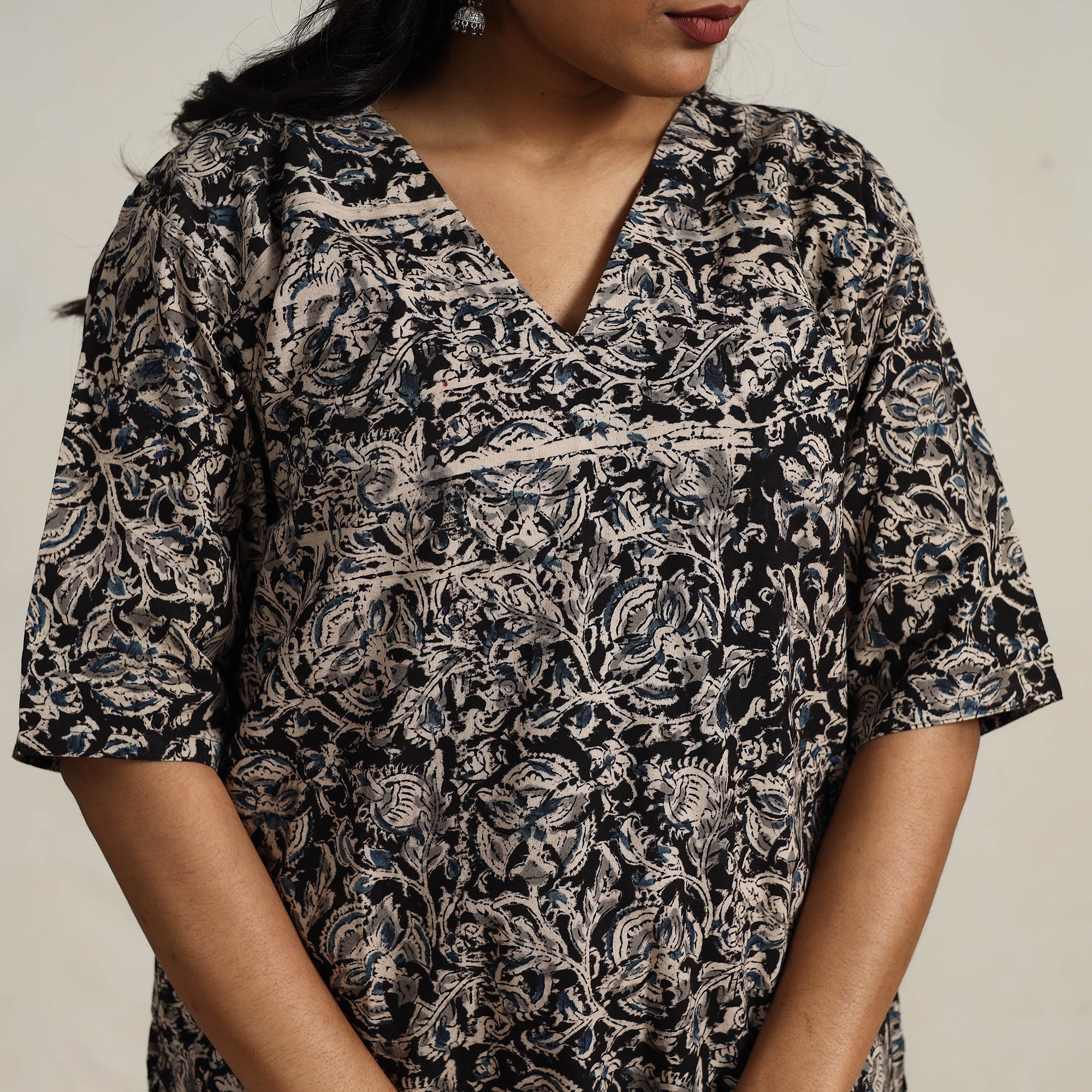 Step into the timeless elegance of tradition with black block printed cotton kalamkari kurta set. This curated set features a cotton kurta, palazzo, and a coordinating dupatta all meticulously handcrafted by skilled artisans. With pockets for practicality and soft, breathable cotton for all-day comfort, it's a wardrobe essential for casual outings or festive moments.