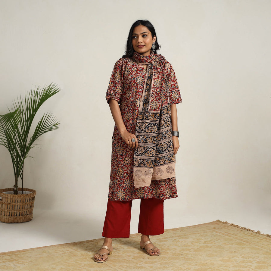 Step into the timeless elegance of tradition with red block printed cotton kalamkari kurta set. This curated set features a cotton kurta, palazzo, and a coordinating dupatta all meticulously handcrafted by skilled artisans. With pockets for practicality and soft, breathable cotton for all-day comfort, it's a wardrobe essential for casual outings or festive moments.