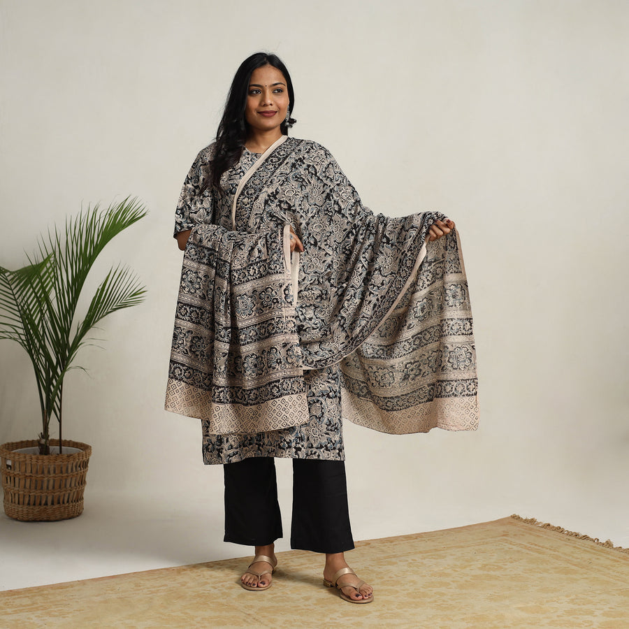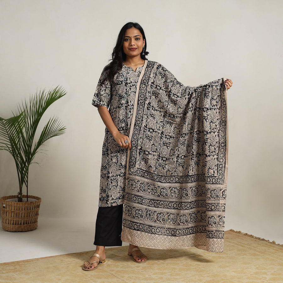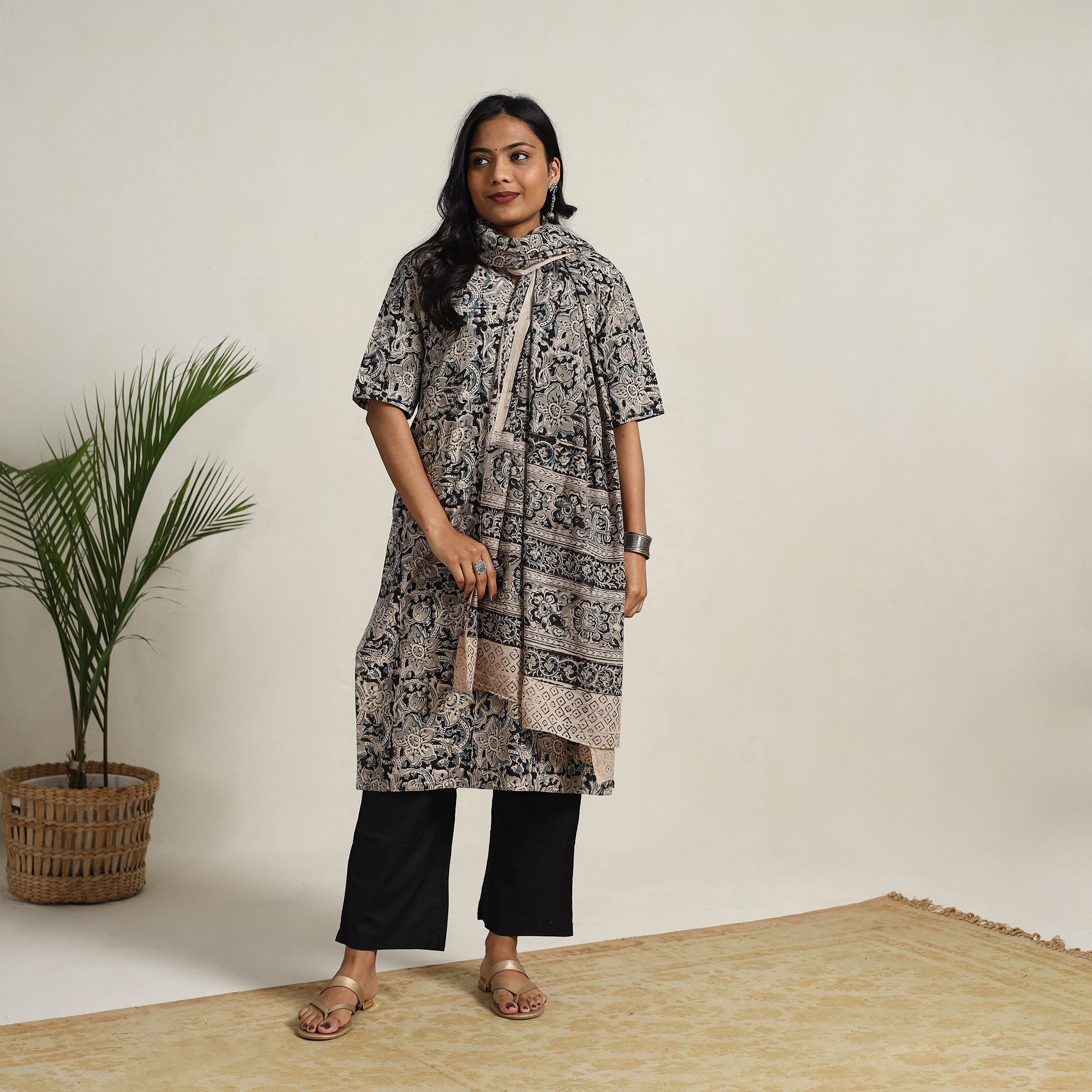 Step into the timeless elegance of tradition with black block printed cotton kalamkari kurta set. This curated set features a cotton kurta, palazzo, and a coordinating dupatta all meticulously handcrafted by skilled artisans. With pockets for practicality and soft, breathable cotton for all-day comfort, it's a wardrobe essential for casual outings or festive moments.