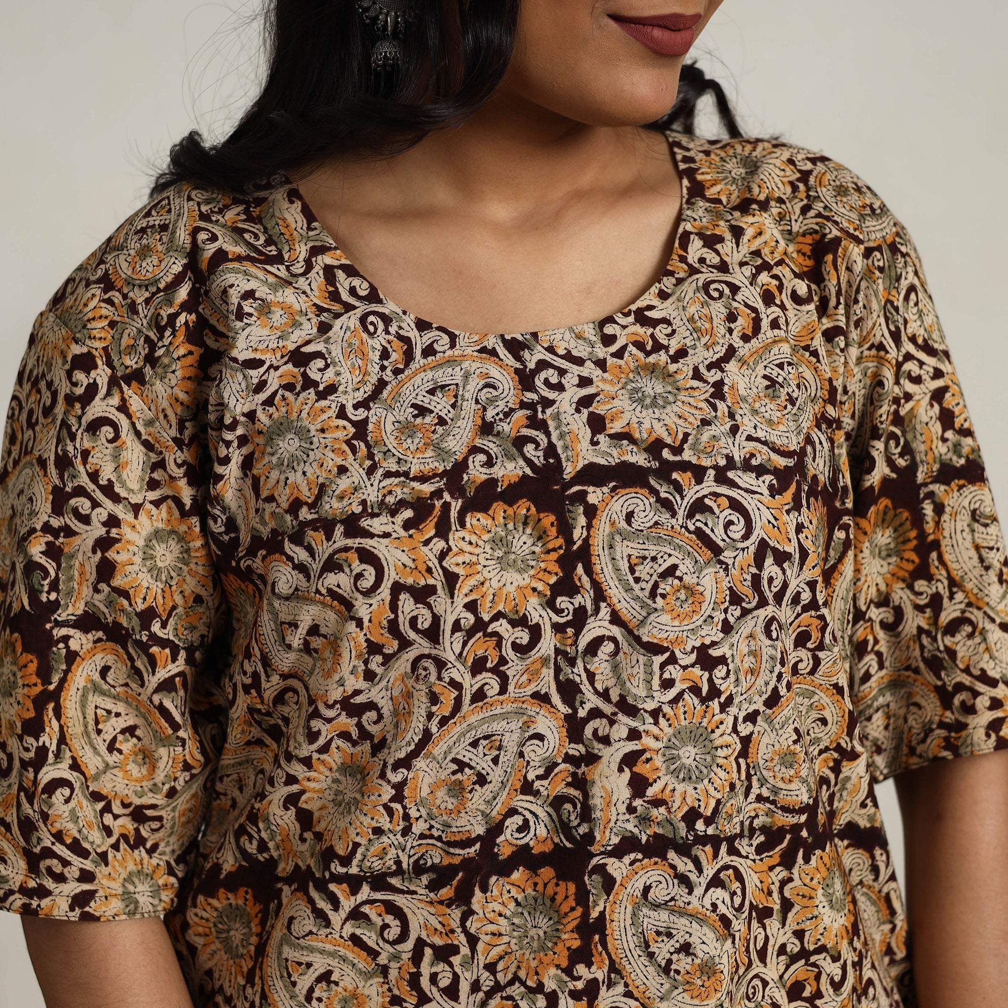 Step into the timeless elegance of tradition with brown block printed cotton kalamkari kurta set. This curated set features a cotton kurta, palazzo, and a coordinating dupatta all meticulously handcrafted by skilled artisans. With pockets for practicality and soft, breathable cotton for all-day comfort, it's a wardrobe essential for casual outings or festive moments.