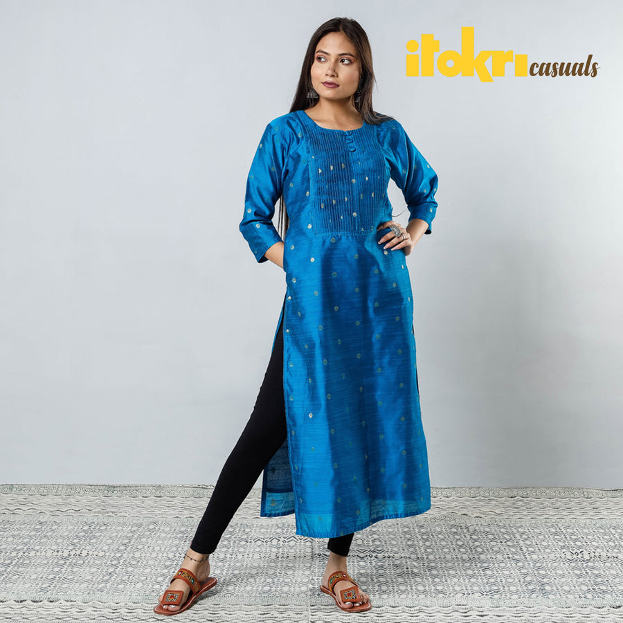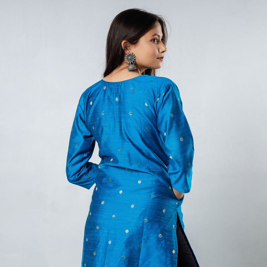Fine quality polka dot zari buti silk long kurta with side pocket. This Kurta is made from a high quality viscose and polyester blend. Look and feel beautiful in this uniquely designed polka dot zari buti silk long Kurta. This silk Kurta will keep you comfortable all day. This Kurta is perfect for your daily outing and for a special occasion.