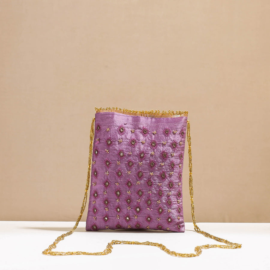 This purple Kala Raksha sling bag features exquisite rabari hand embroidery with a beaded sling. Made by skilled artisans using traditional techniques, the bag is both durable and stylish, making it perfect for everyday use. The intricate embroidery showcases the rich cultural heritage of the Kala Raksha community, and the attention to detail is evident in every stitch. Rabari embroidery is unique to the nomadic Rabaris. Essential to Rabari embroidery is the use of mirrors in a variety of shapes. Rabaris outline patterns in chain stitch, then decorate them with a regular sequence of mirrors and accent stitches, in a regular sequence of colors. Rabaris also use decorative back stitching, called bakhiya.