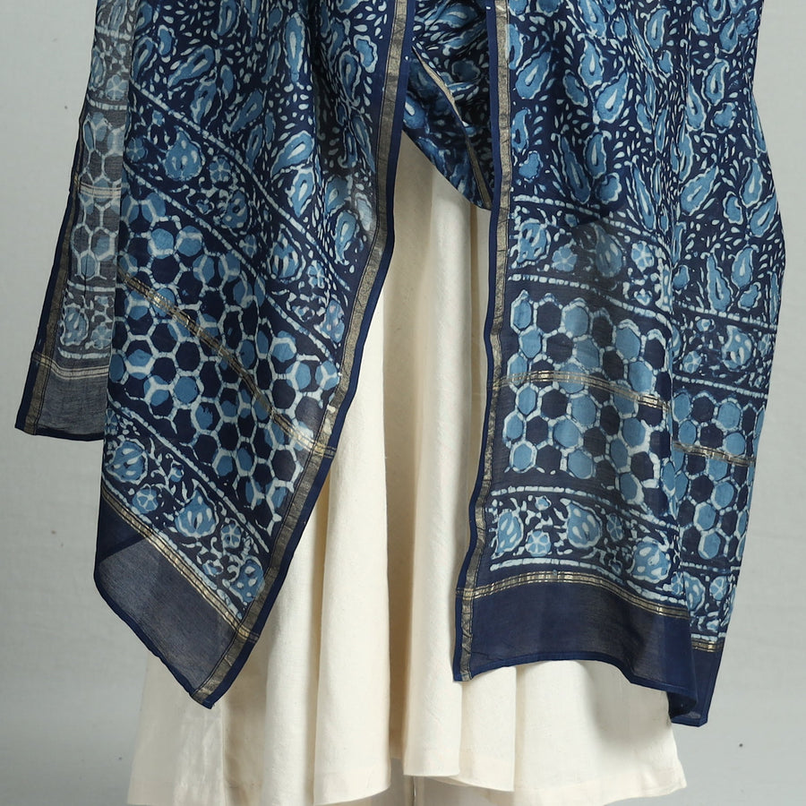 Elevate your ethnic ensemble with this fine quality pipad hand block printed chanderi silk-cotton handloom dupatta. The intricate design is made using natural dyes through traditional mud resist process by Chhipa Azhar practiced in Pipar, Rajasthan. With its gossamer look and plush feel, this dupatta is accented with a woven zari border for added elegance.