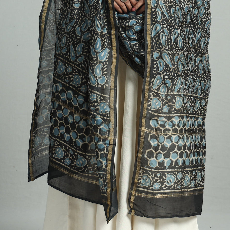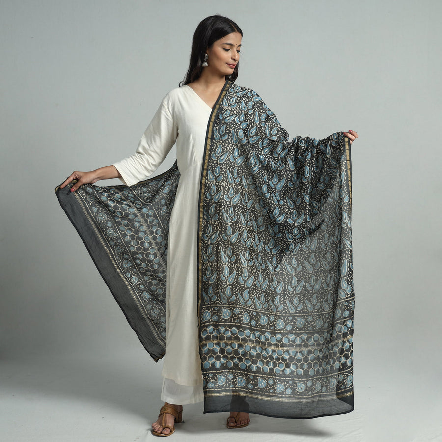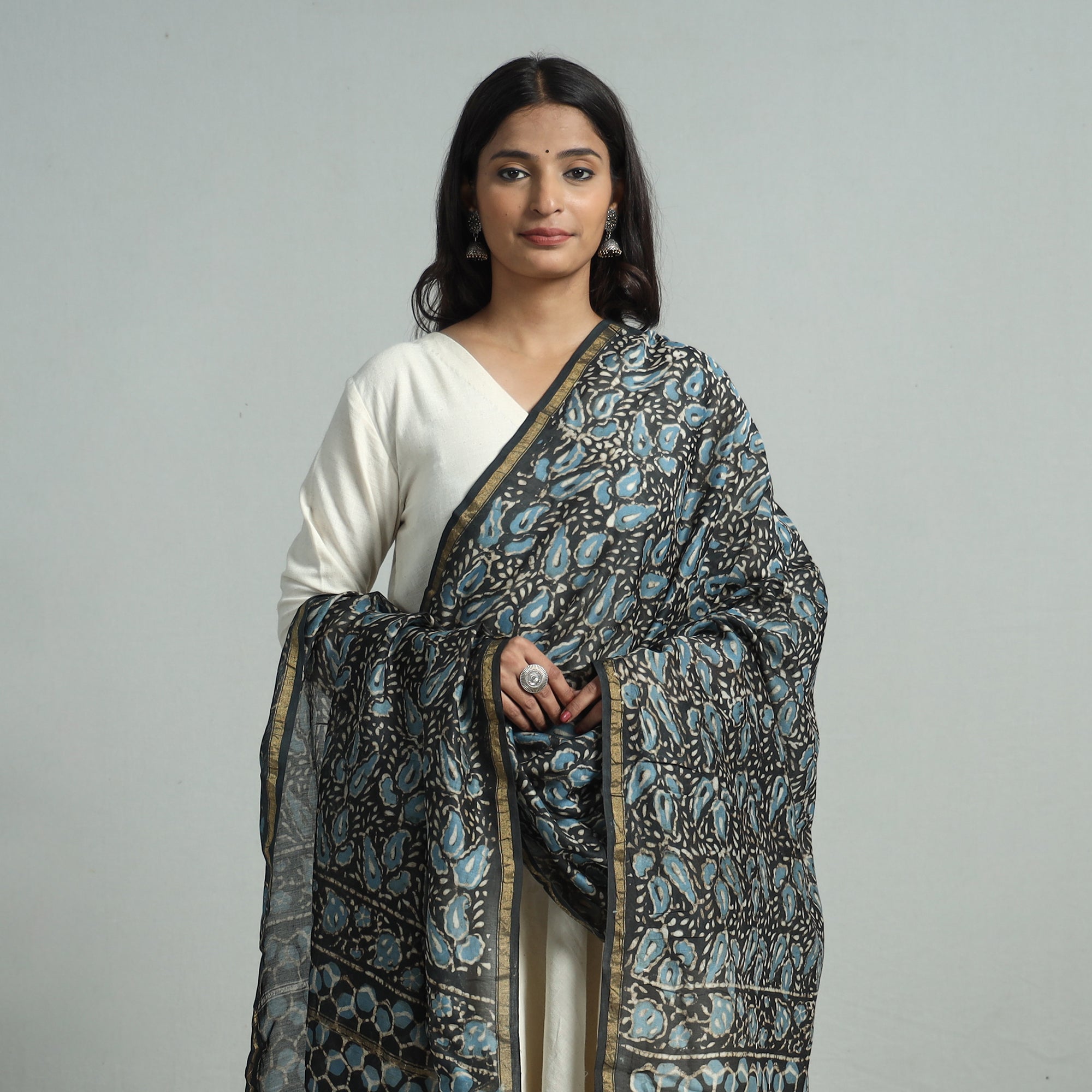 Elevate your ethnic ensemble with this fine quality pipad hand block printed chanderi silk-cotton handloom dupatta. The intricate design is made using natural dyes through traditional mud resist process by Chhipa Azhar practiced in Pipar, Rajasthan. With its gossamer look and plush feel, this dupatta is accented with a woven zari border for added elegance.