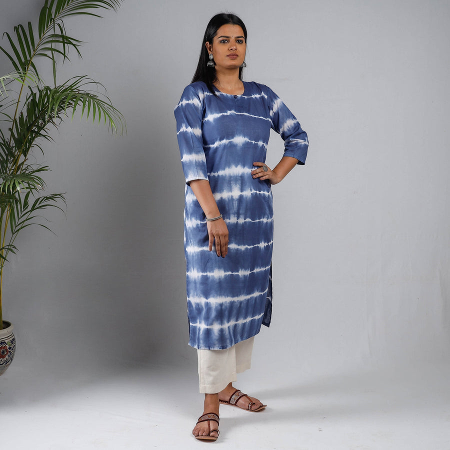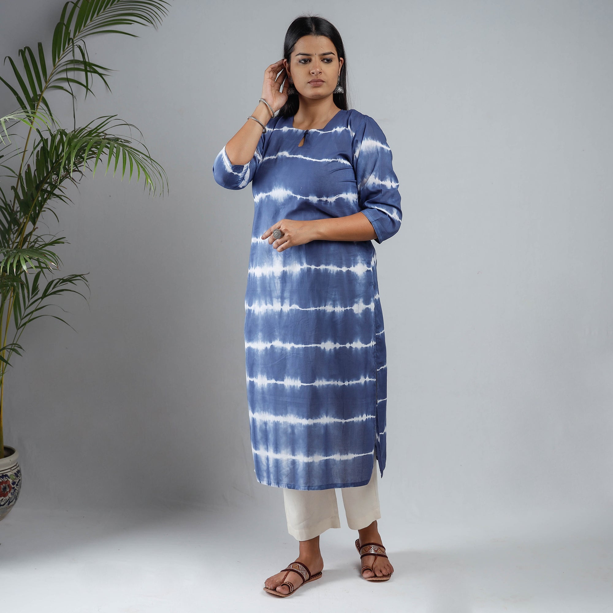 Look and feel beautiful in this uniquely designed shibori tie-dye mul cotton long kurta with one side pocket. This cotton kurta makes you comfortable with ease all day long. This kurta is hand dyed using the shibori tie and dye technique, in which the fabric is tied using clamps or stitches in the required design and the pattern is dyed.