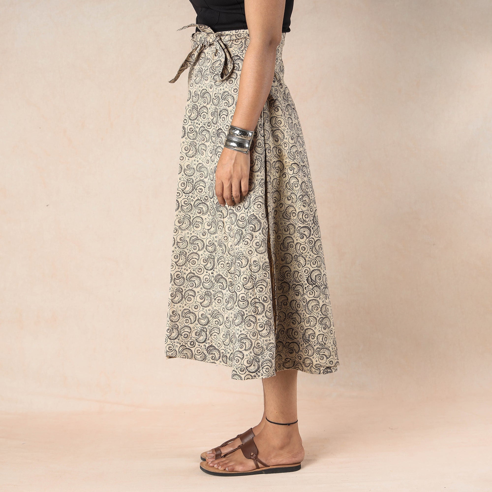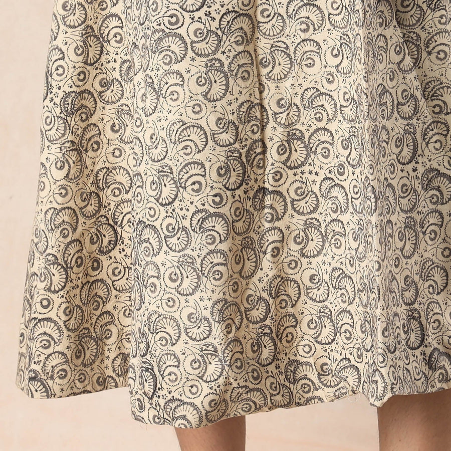 | Material | Fine quality cotton kalamkari hand block printed wrap-around skirt featuring a waist tie-up closure. The intricate hand block printing showcases an assortment of motifs inspired by traditional kalamkari painting, making it a unique and stylish addition to any wardrobe. Kalamkari is one of the oldest and most complex techniques of block printing, making this skirt not only beautiful but also a tribute to traditional Indian craftsmanship. |