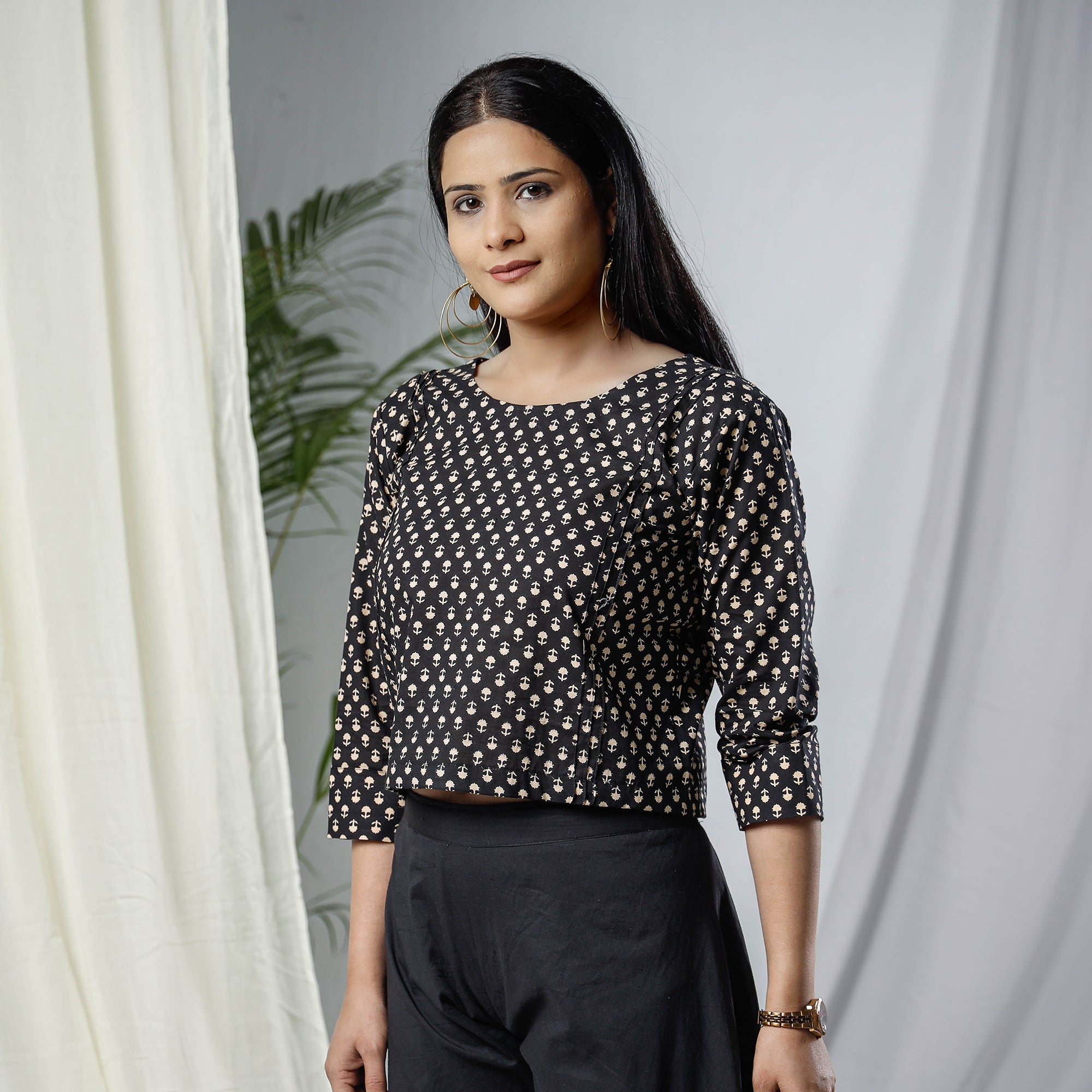 Look and feel beautiful in this uniquely designed black sanganeri hand block pritsfull sleeve crop top. Made of cotton fabric, this regular-fit crop top is extremely comfortable to wear all day long. This crop top is perfect for your daily outing and for a special occasion.