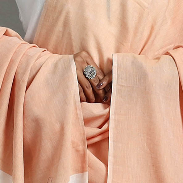 Elevate your wardrobe with this exquisite peach phulia bengal cotton handloom dupatta with tassels. Woven by skilled artisans this dupatta boasts lightweight breathable cotton perfect for year round wear. Handcrafted with care it reflects Phulia’s rich weaving heritage combining tradition with modern elegance. Its natural softness and absorbent qualities ensure comfort while tassel details add a touch of sophistication.