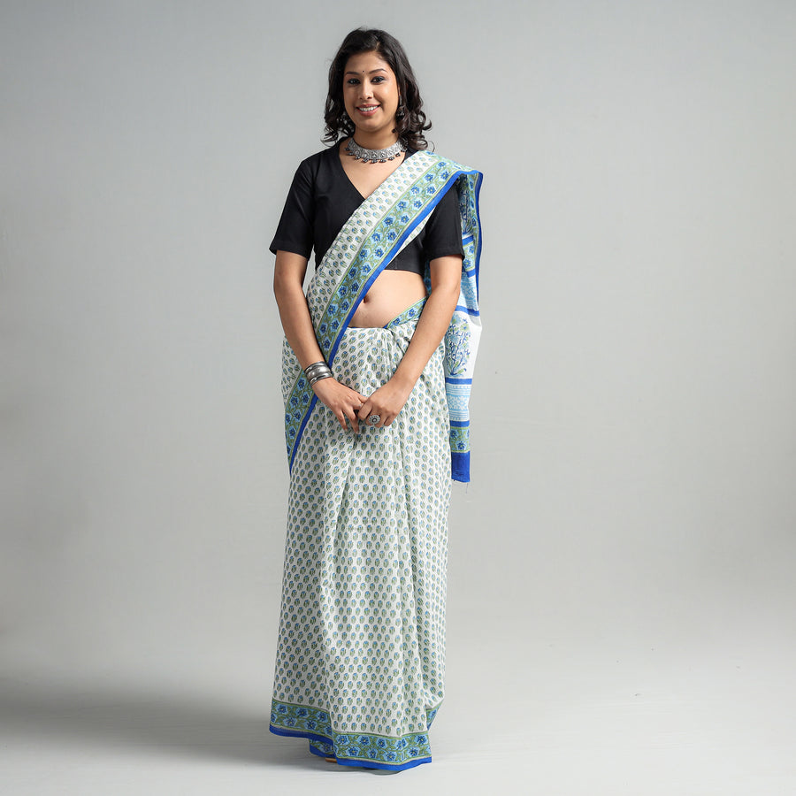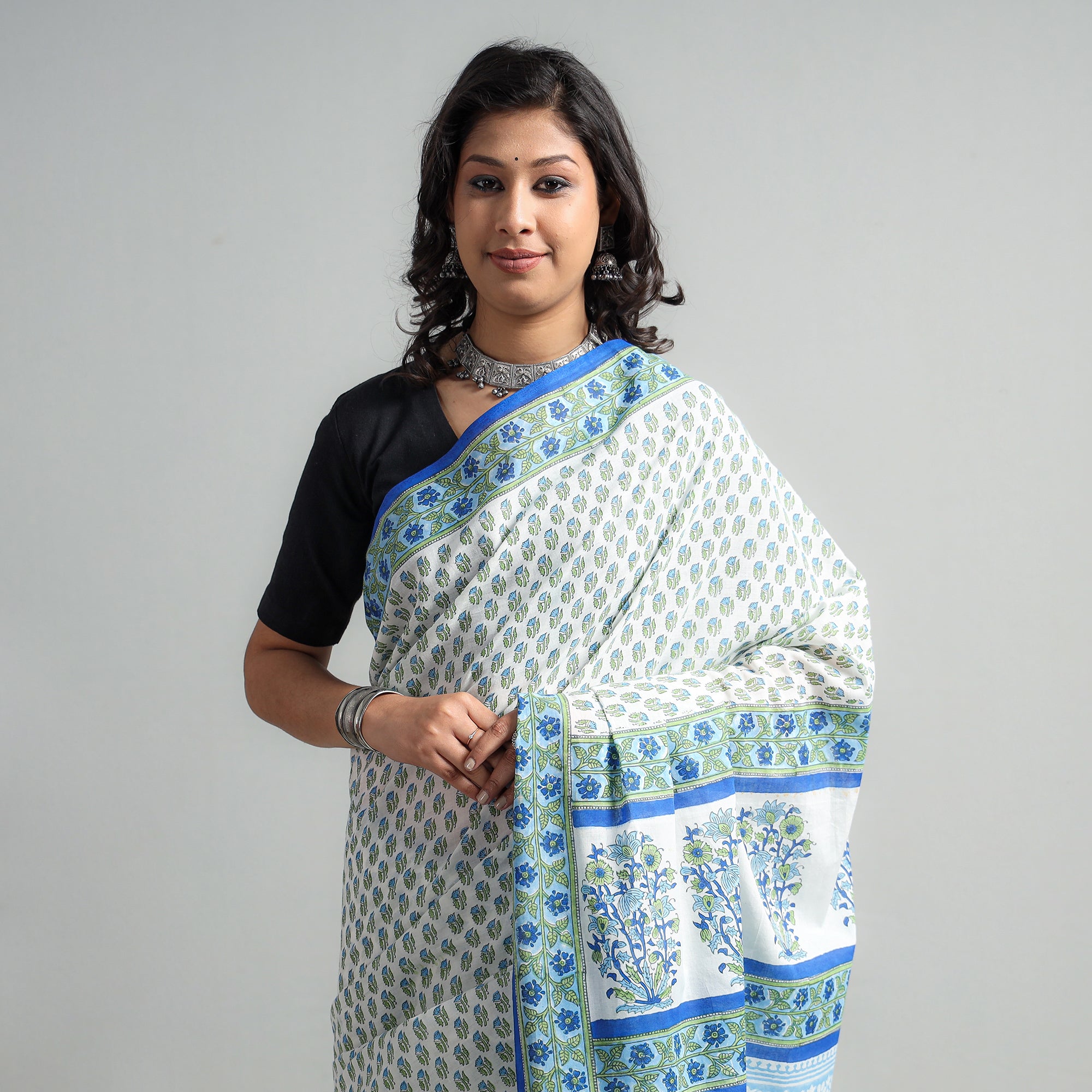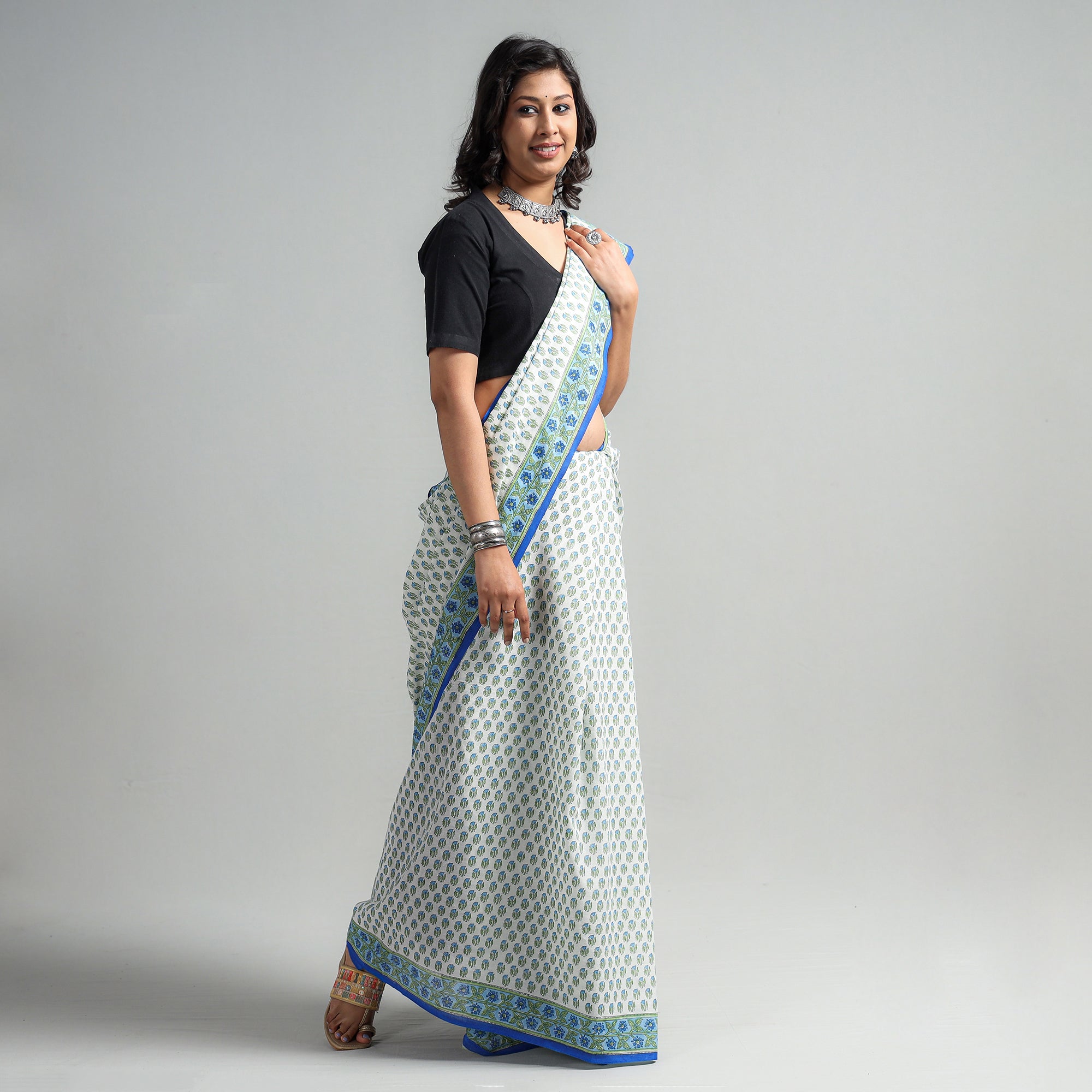Fine quality sanganeri hand block printed mul cotton saree. Sanganeri is a hand-block printing technique originating from Sanganer, a village in the southern part of Jaipur, Rajasthan. Bleed free VAT dyes used. Hand block prints by Santosh Dhanopia.