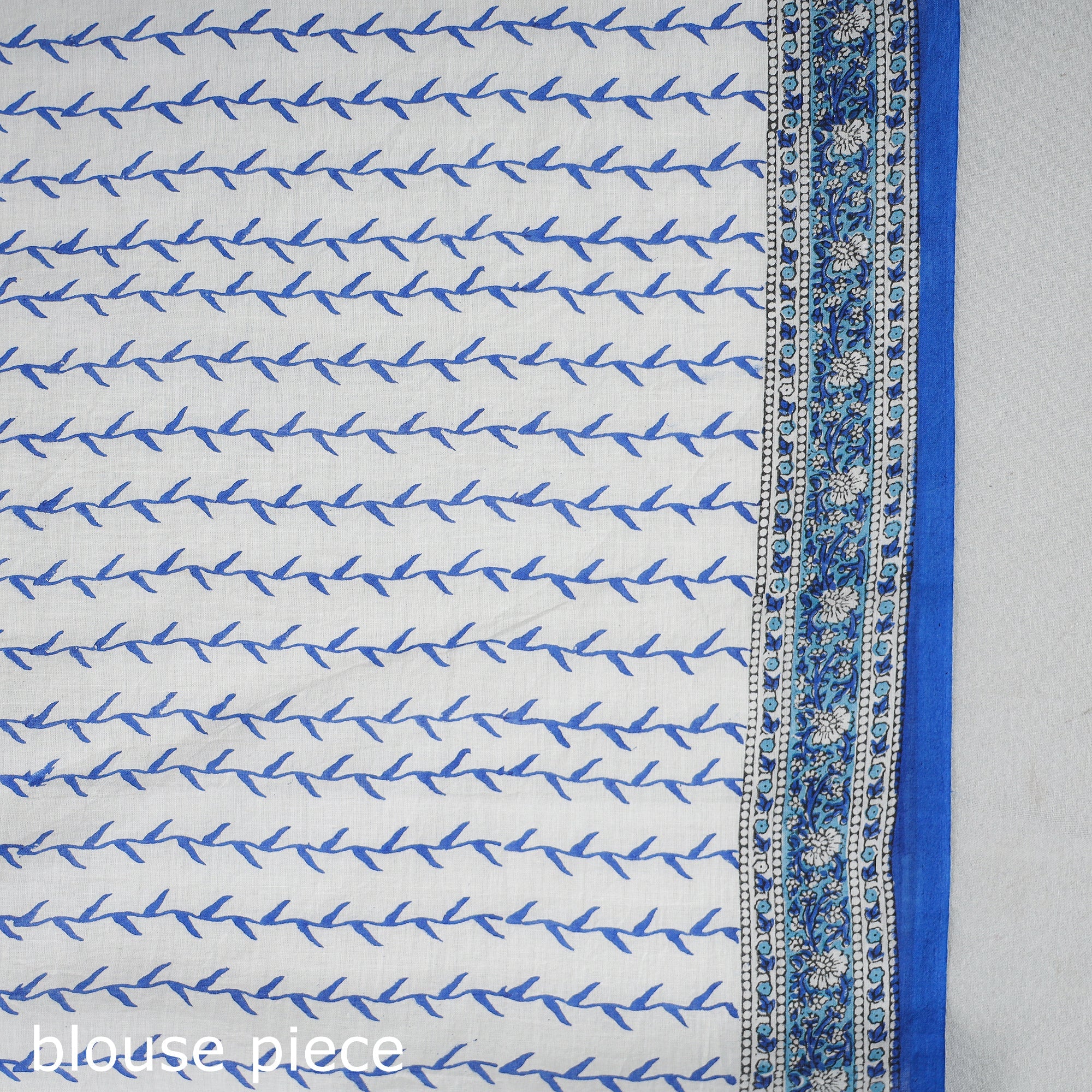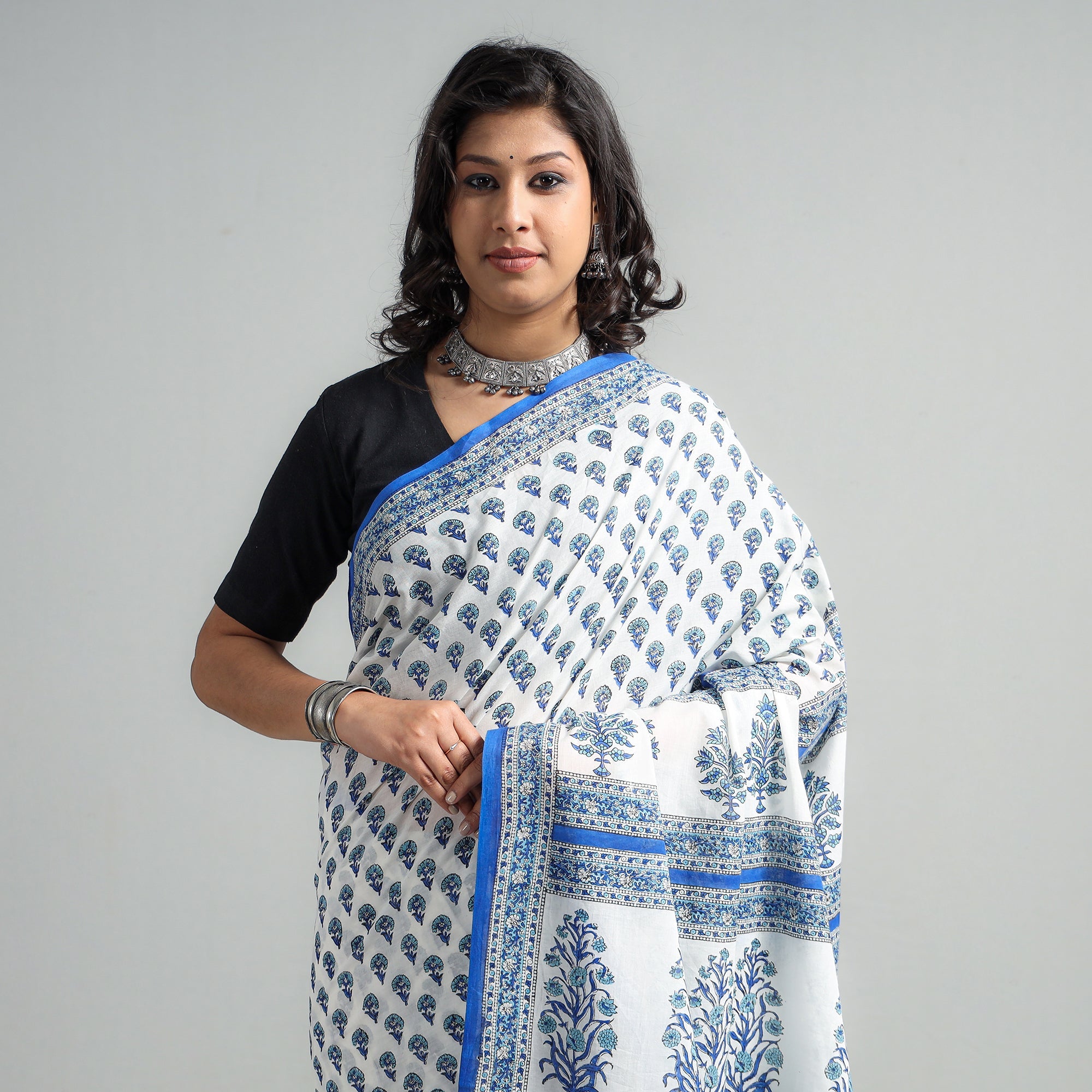 Blue - Block Printed Mul Cotton Sanganeri Saree
