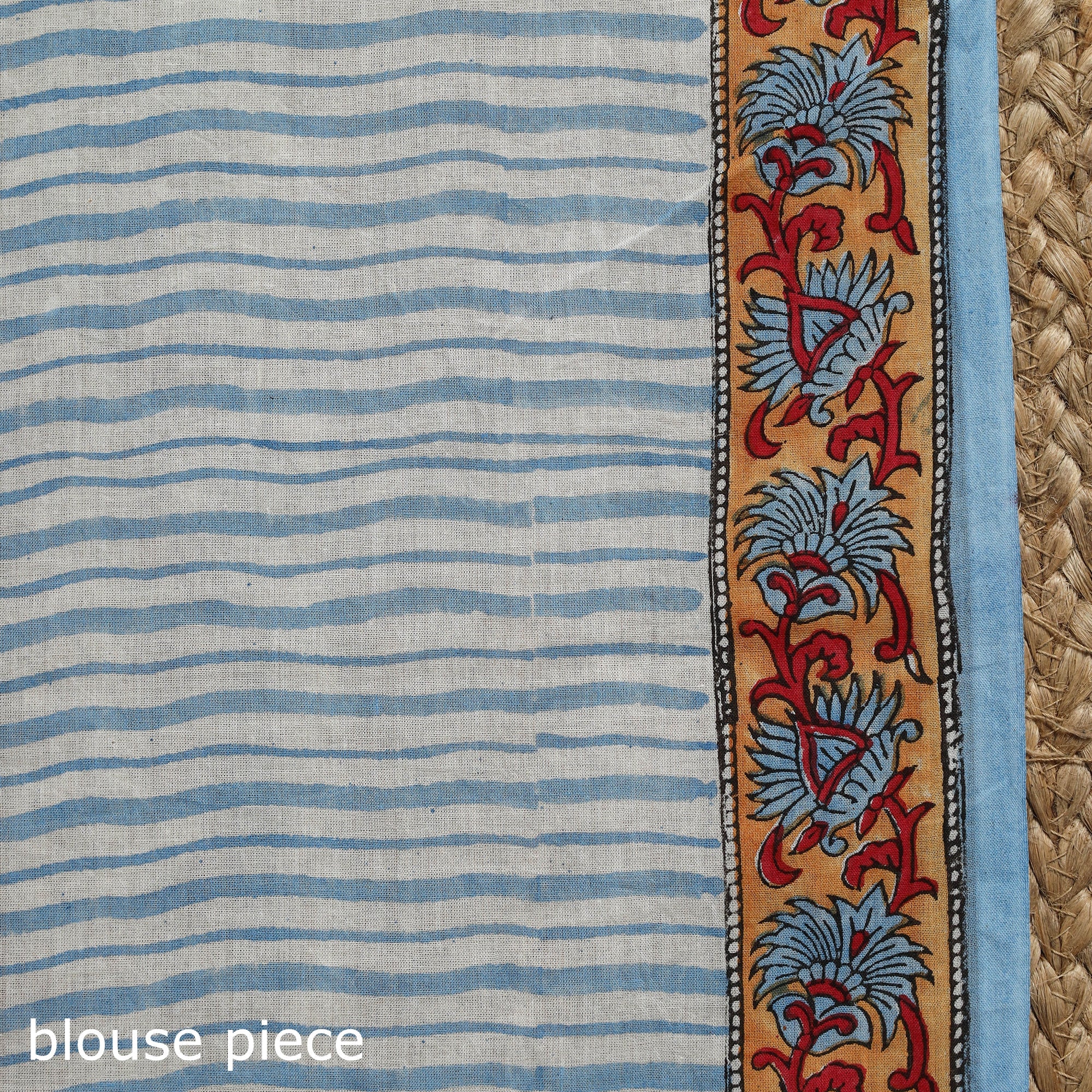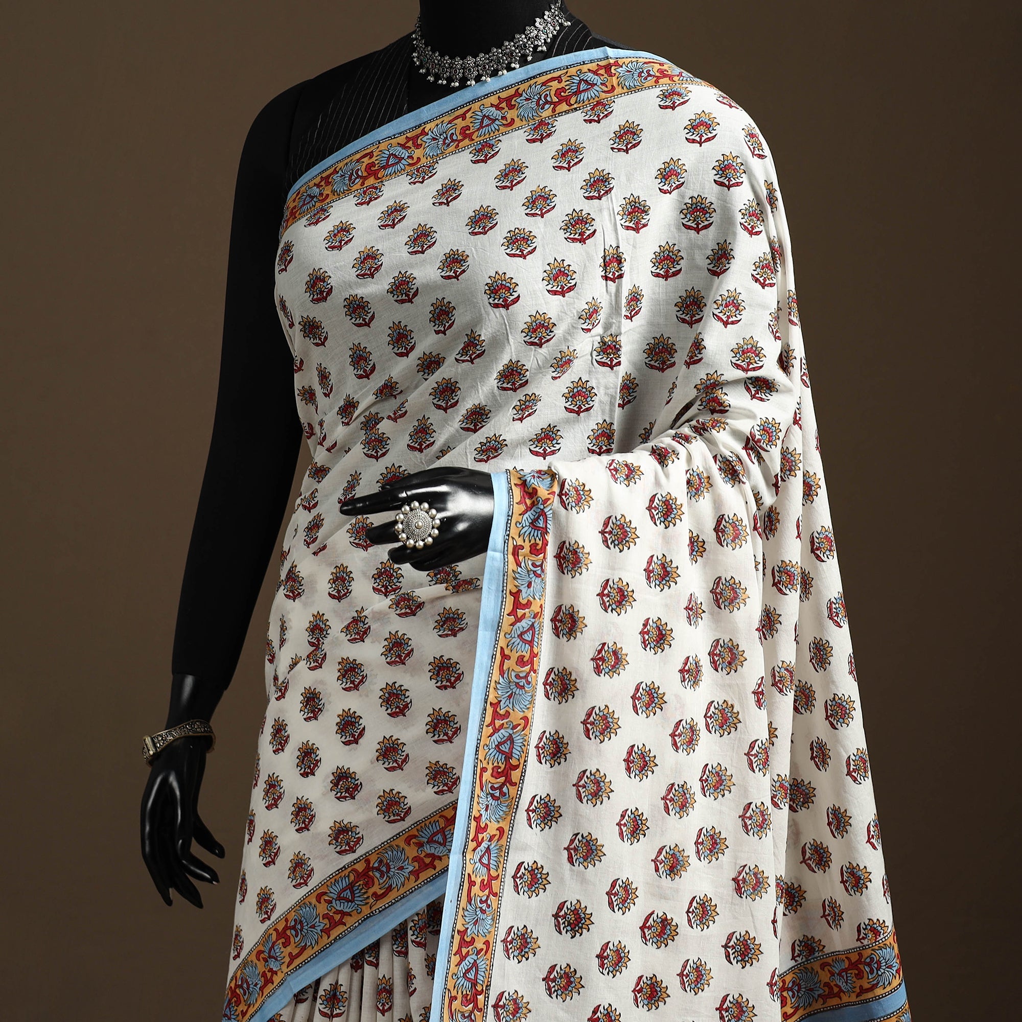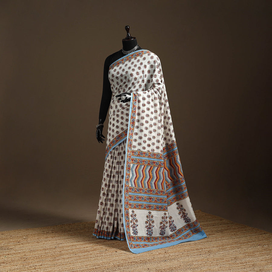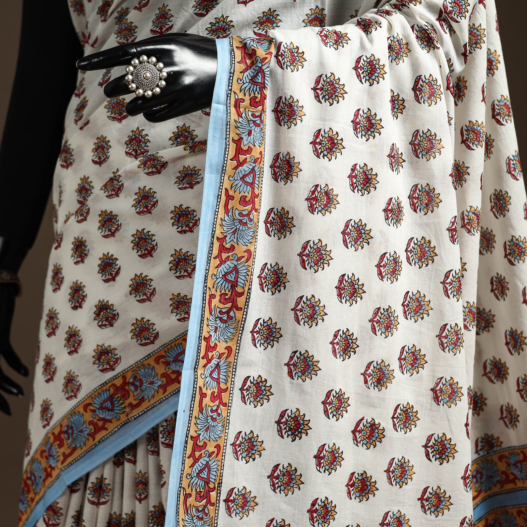 Fine quality white sanganeri hand block printed mul cotton saree. Sanganeri is a hand-block printing technique originating from Sanganer, a village in the southern part of Jaipur, Rajasthan. Bleed free VAT dyes used. Hand block prints by Santosh Dhanopia.