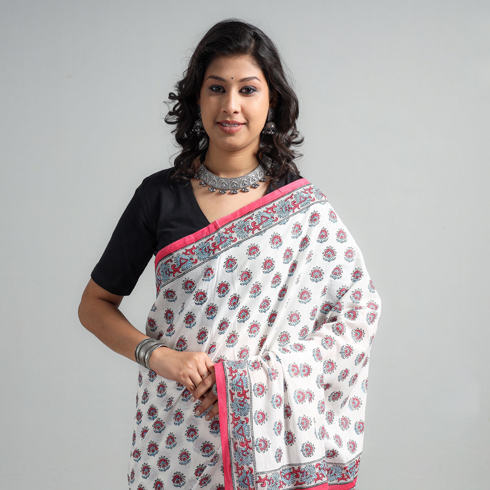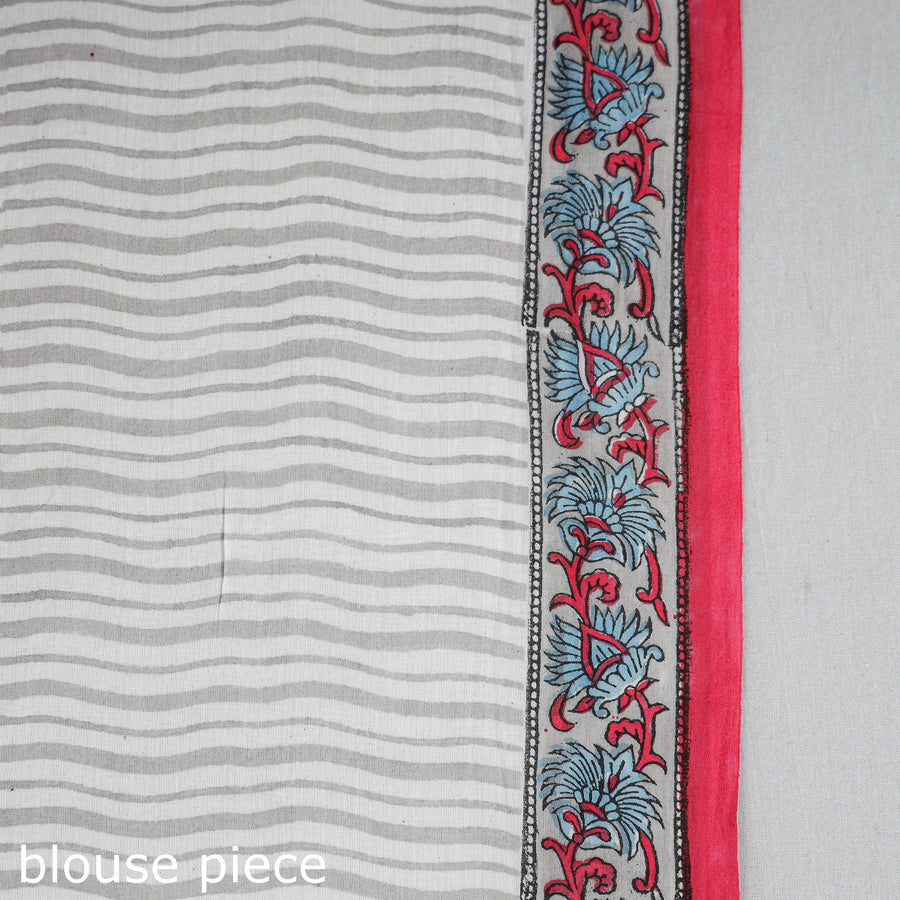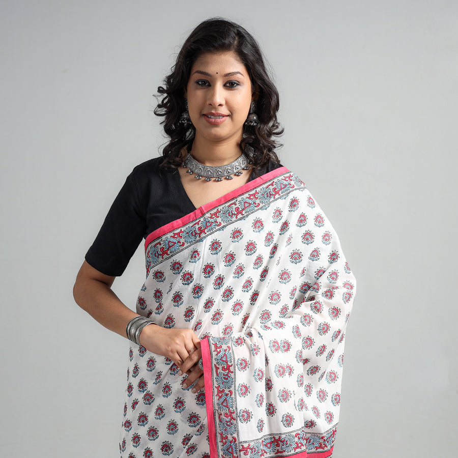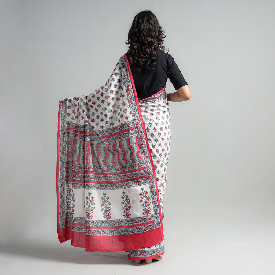 Fine quality sanganeri hand block printed mul cotton saree. Sanganeri is a hand-block printing technique originating from Sanganer, a village in the southern part of Jaipur, Rajasthan. Bleed free VAT dyes used. Hand block prints by Santosh Dhanopia.