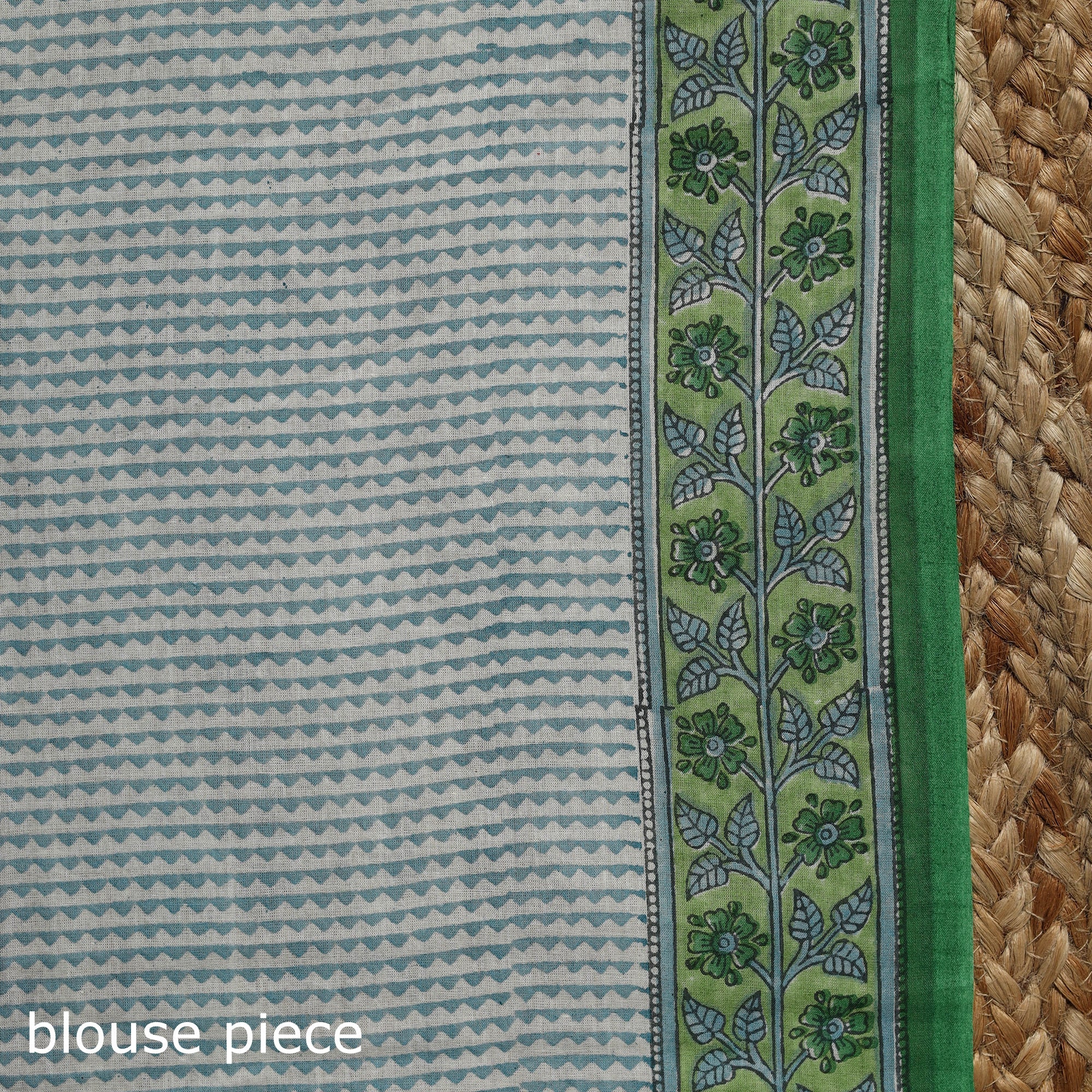 Fine quality green sanganeri hand block printed mul cotton saree. Sanganeri is a hand-block printing technique originating from Sanganer, a village in the southern part of Jaipur, Rajasthan. Bleed free VAT dyes used. Hand block prints by Santosh Dhanopia.