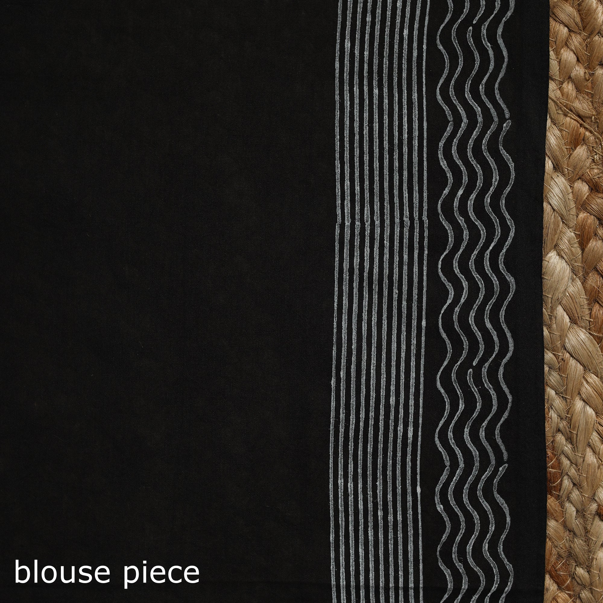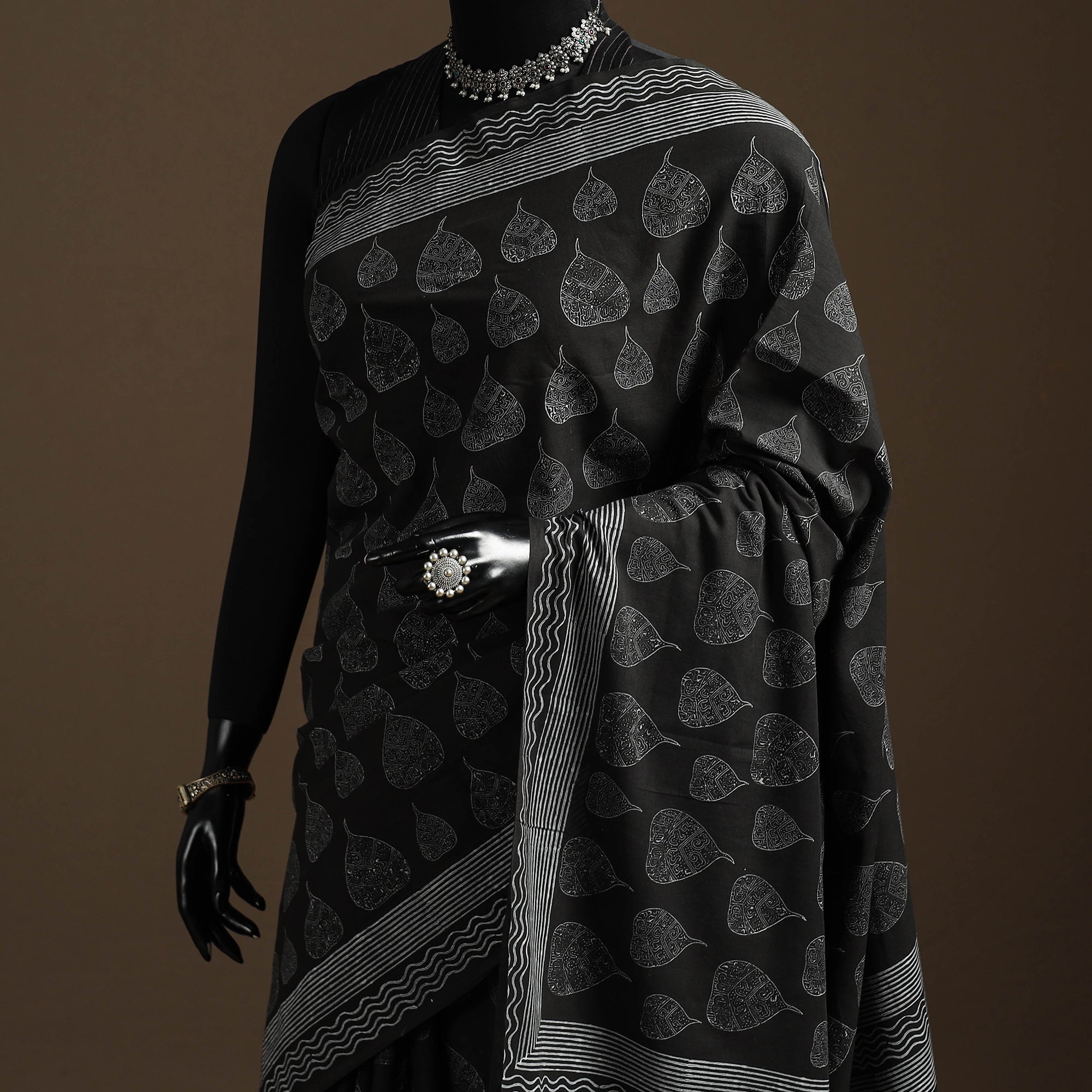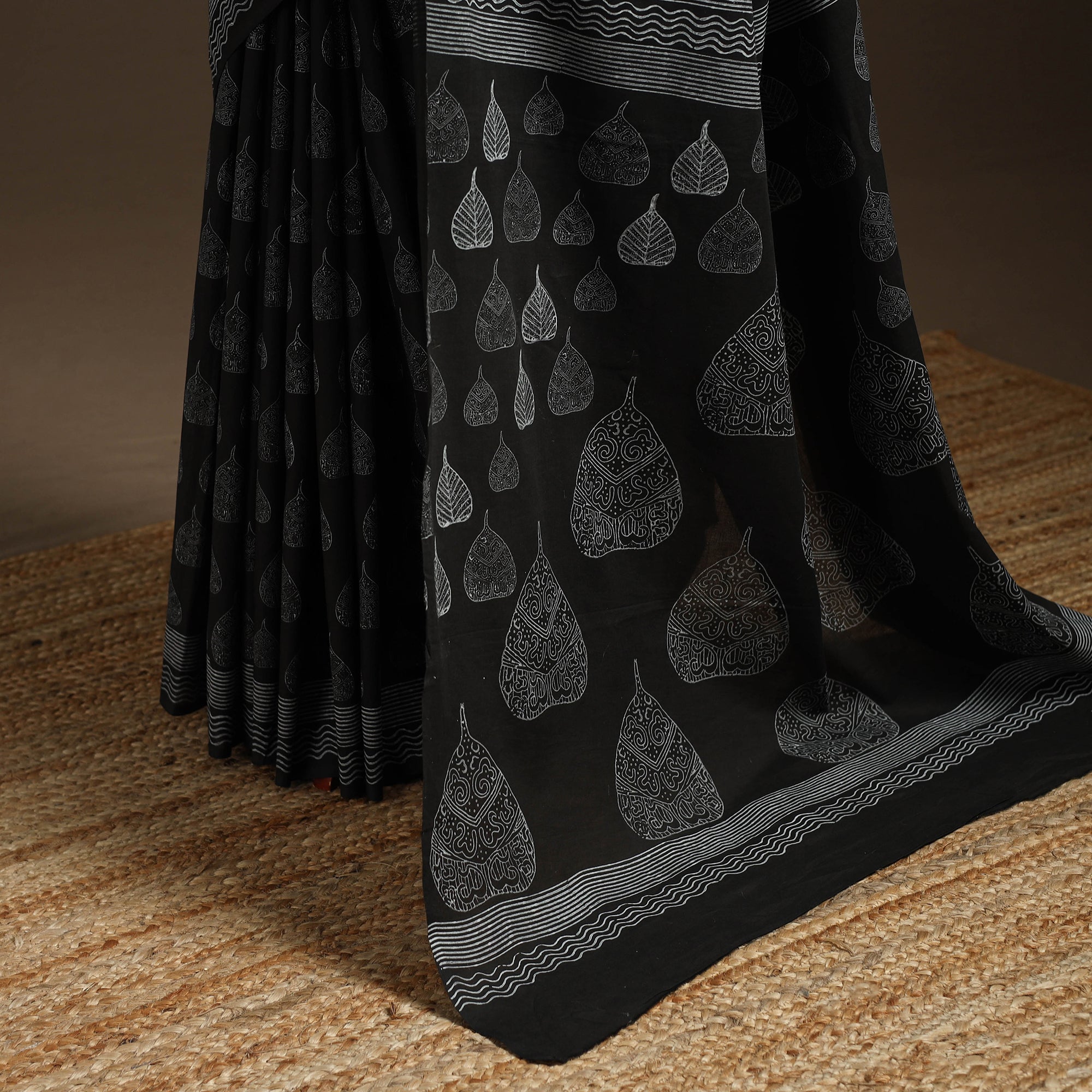 Fine quality black sanganeri hand block printed mul cotton saree. Sanganeri is a hand-block printing technique originating from Sanganer, a village in the southern part of Jaipur, Rajasthan. Bleed free VAT dyes used. Hand block prints by Santosh Dhanopia.
