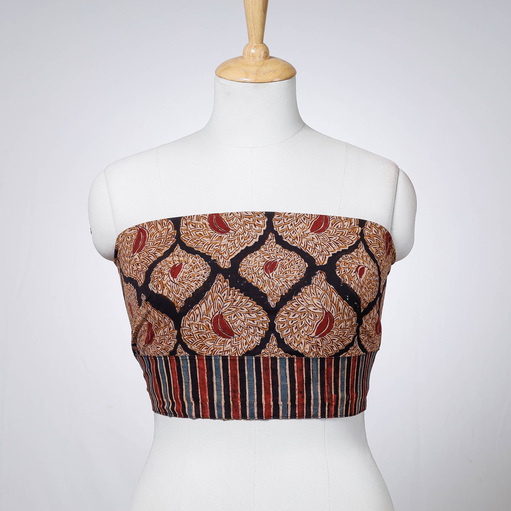 Fine quality kalamkari block printing cotton blouse piece made from mix & matched cotton fabrics & textured with handmade textiles of India. This mix & match blouse material will go with almost all of your sarees & enhance your look.