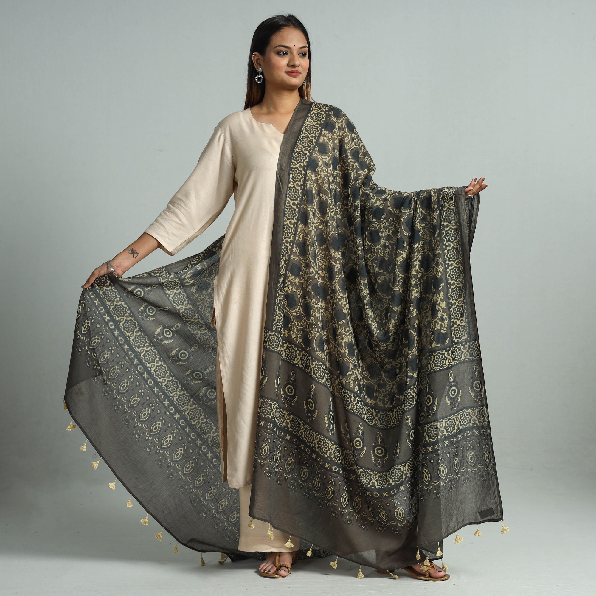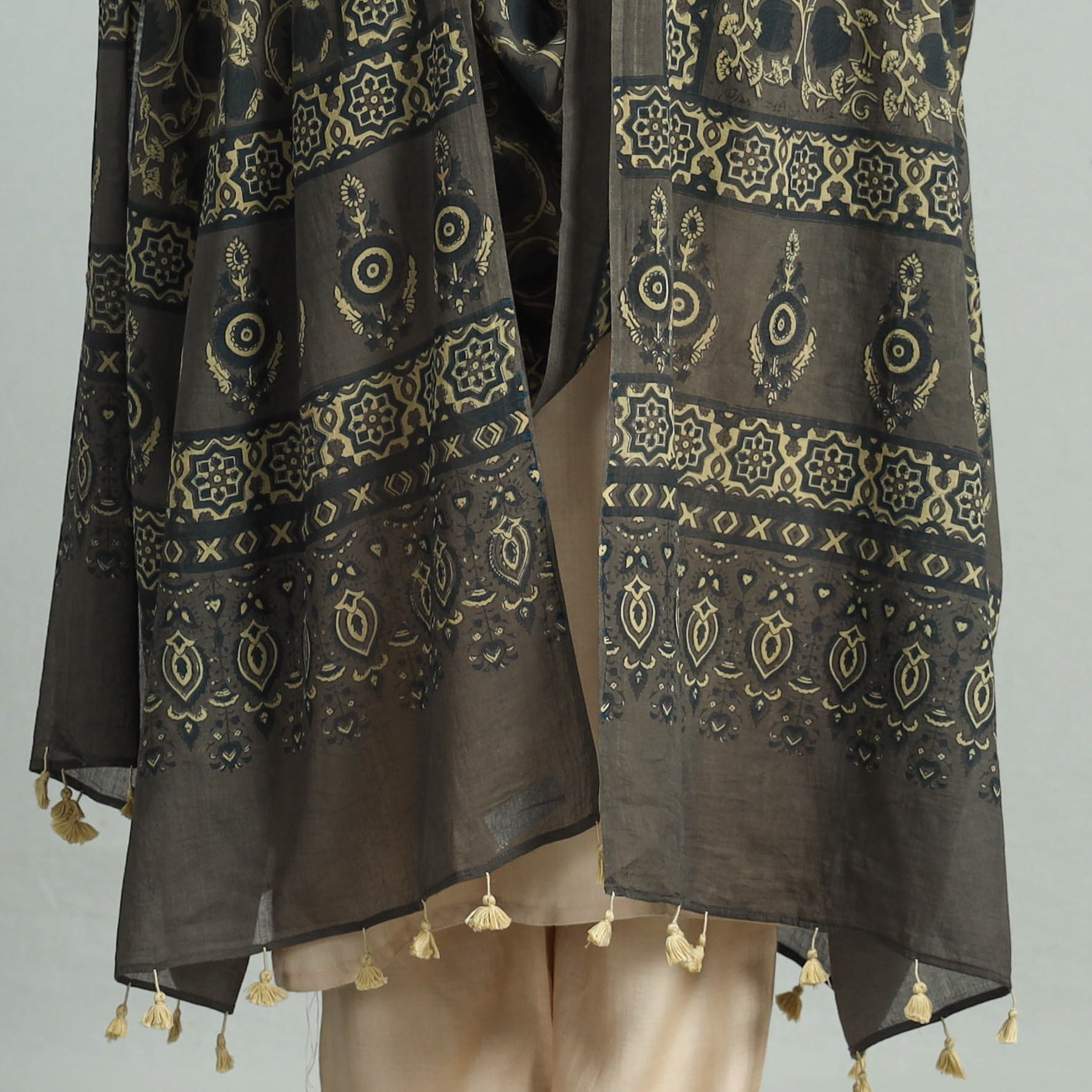 Add a touch of tradition with our brown hand block printed mul cotton ajrakh dupatta. Crafted with care by artisans from Kutch, Gujarat, this dupatta showcases the rich heritage of Ajrakh printing, using natural dyes and traditional techniques. Each piece is a testament to the timeless art of hand block printing.
