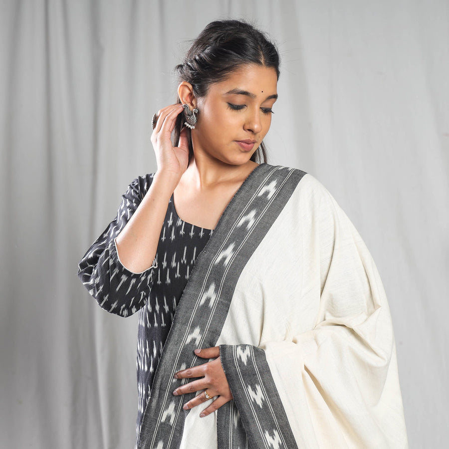 Elevate your style with this exquisite pochampally ikat cotton suit set. Featuring a uniquely designed long kurta with side pockets, palazzo, and dupatta, this set offers comfort and elegance all day long. Whether for daily wear or a special occasion, this suit is a perfect choice for those who appreciate fine craftsmanship and beautiful textiles. Look and feel beautiful in this stunning ensemble. Ikat has lovely patterns in extremely beautiful colours. Ikat fabrics are world famous for their colours, texture and designs. This is a power-loom dress, only hand tie-dye process has been involved.