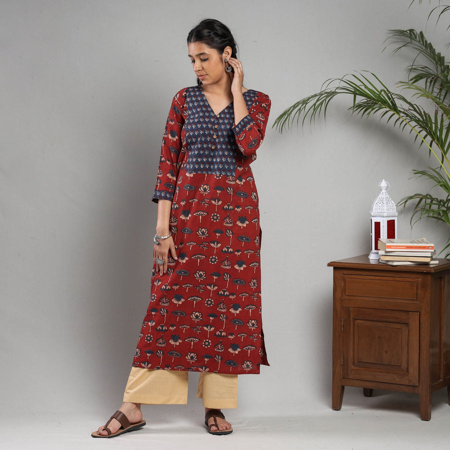 Look and feel beautiful in this uniquely designed ajrakh hand block printing cotton long red kurta with palazzo set. This suit set contains a cotton kurta and plain palazzo. The kurta has one side pocket, and the palazzo has two side pockets. This cotton suit makes you comfortable with ease all day long. This suit is perfect for your daily outing and for a special occasion.