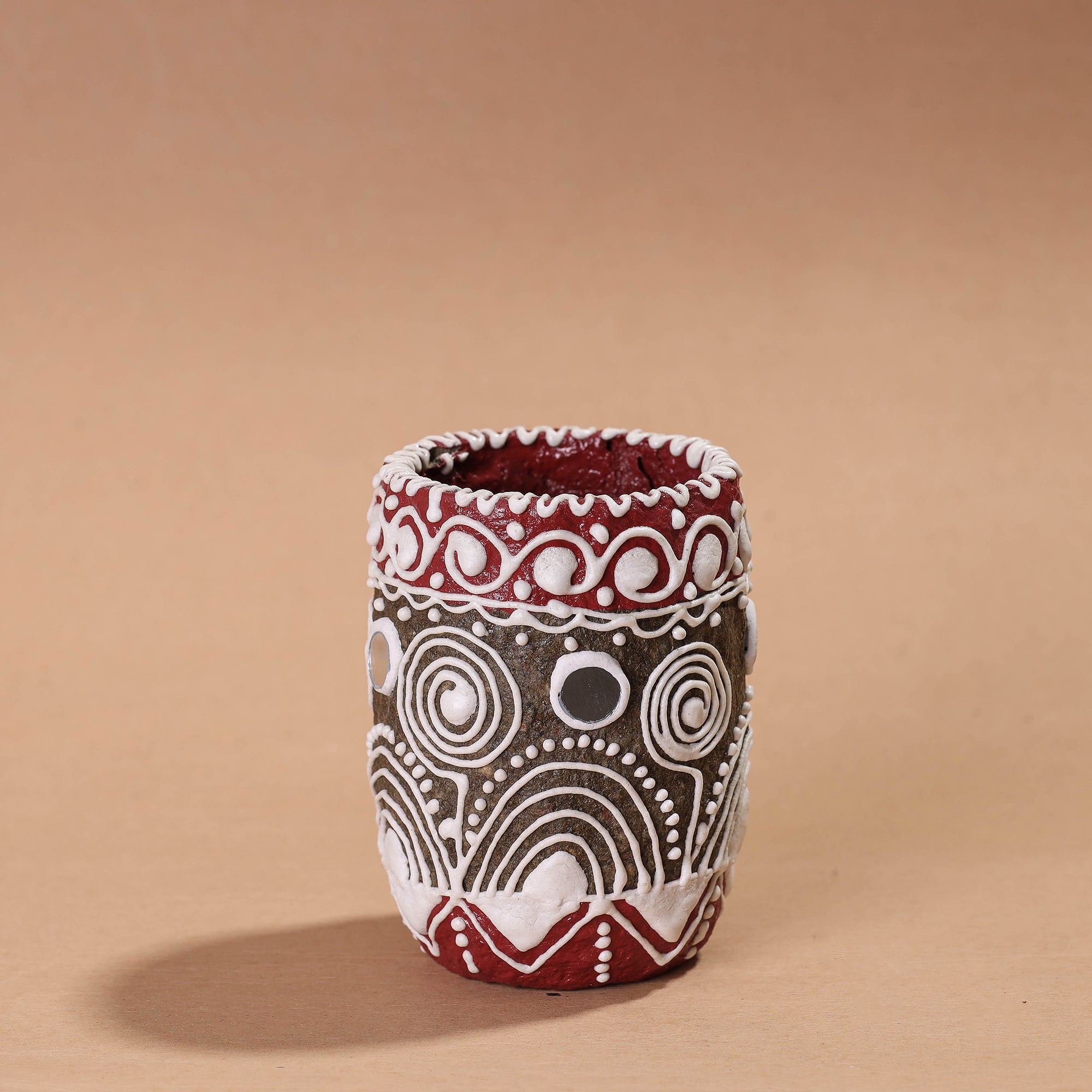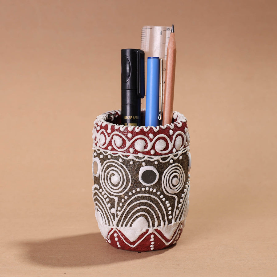 Decorative brown mandana art paper mache pen stand handpainted with acrylic colours by master artisan Kaluram Meghvanshi from Rajasthan. This pen stand is made of newspaper or any other waste paper, methi powder and designed using ceramic powder on it. It features intricate Mandana art designs in vibrant colours that truly stand out.