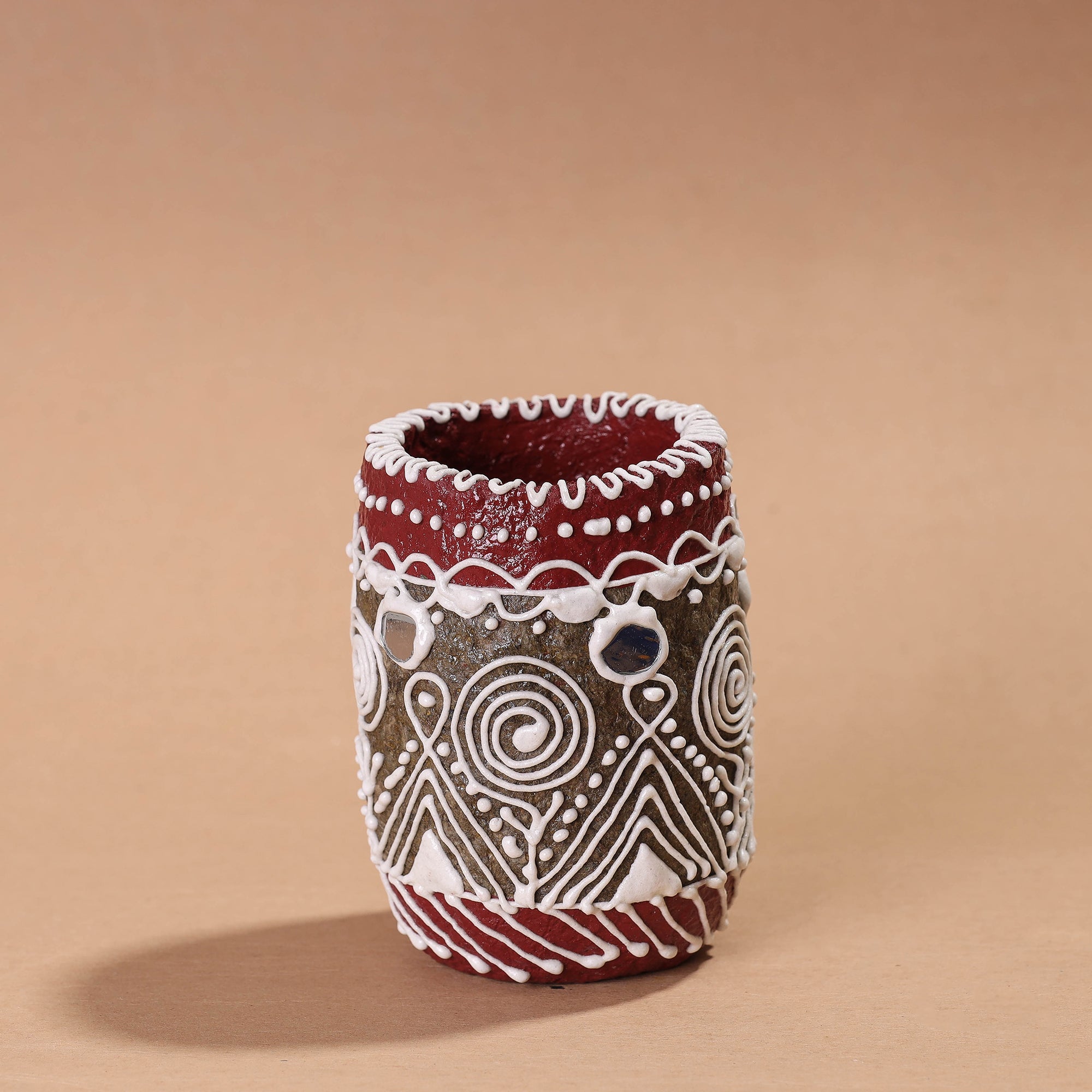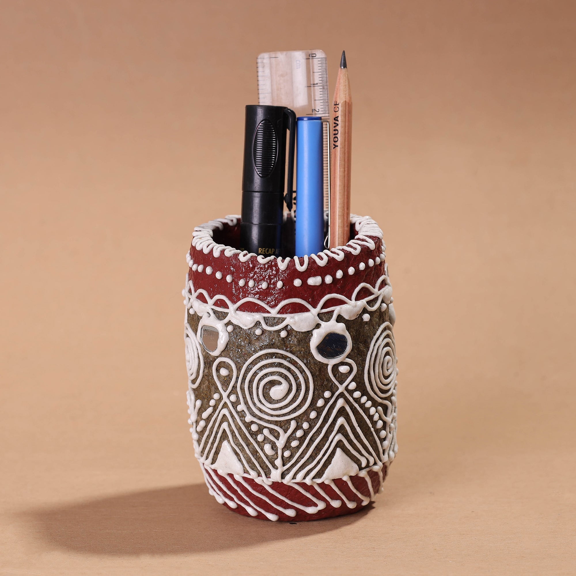 Decorative brown mandana art paper mache pen stand handpainted with acrylic colours by master artisan Kaluram Meghvanshi from Rajasthan. This pen stand is made of newspaper or any other waste paper, methi powder and designed using ceramic powder on it. It features intricate Mandana art designs in vibrant colours that truly stand out.