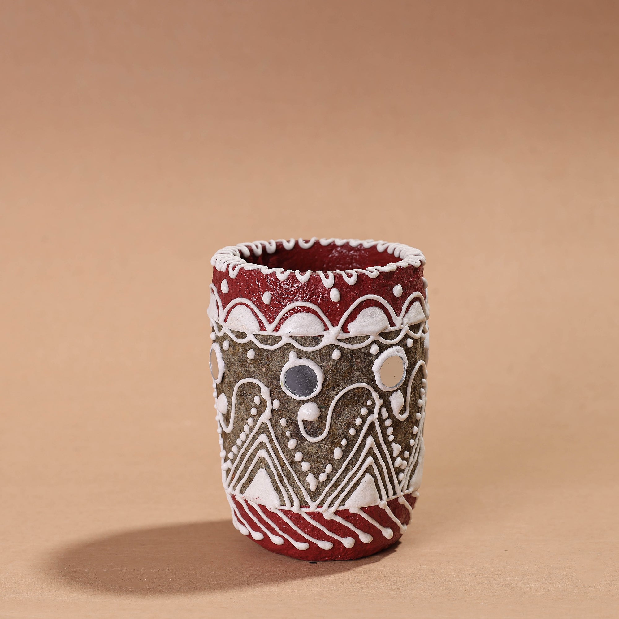 Decorative brown mandana art paper mache pen stand handpainted with acrylic colours by master artisan Kaluram Meghvanshi from Rajasthan. This pen stand is made of newspaper or any other waste paper, methi powder and designed using ceramic powder on it. It features intricate Mandana art designs in vibrant colours that truly stand out.