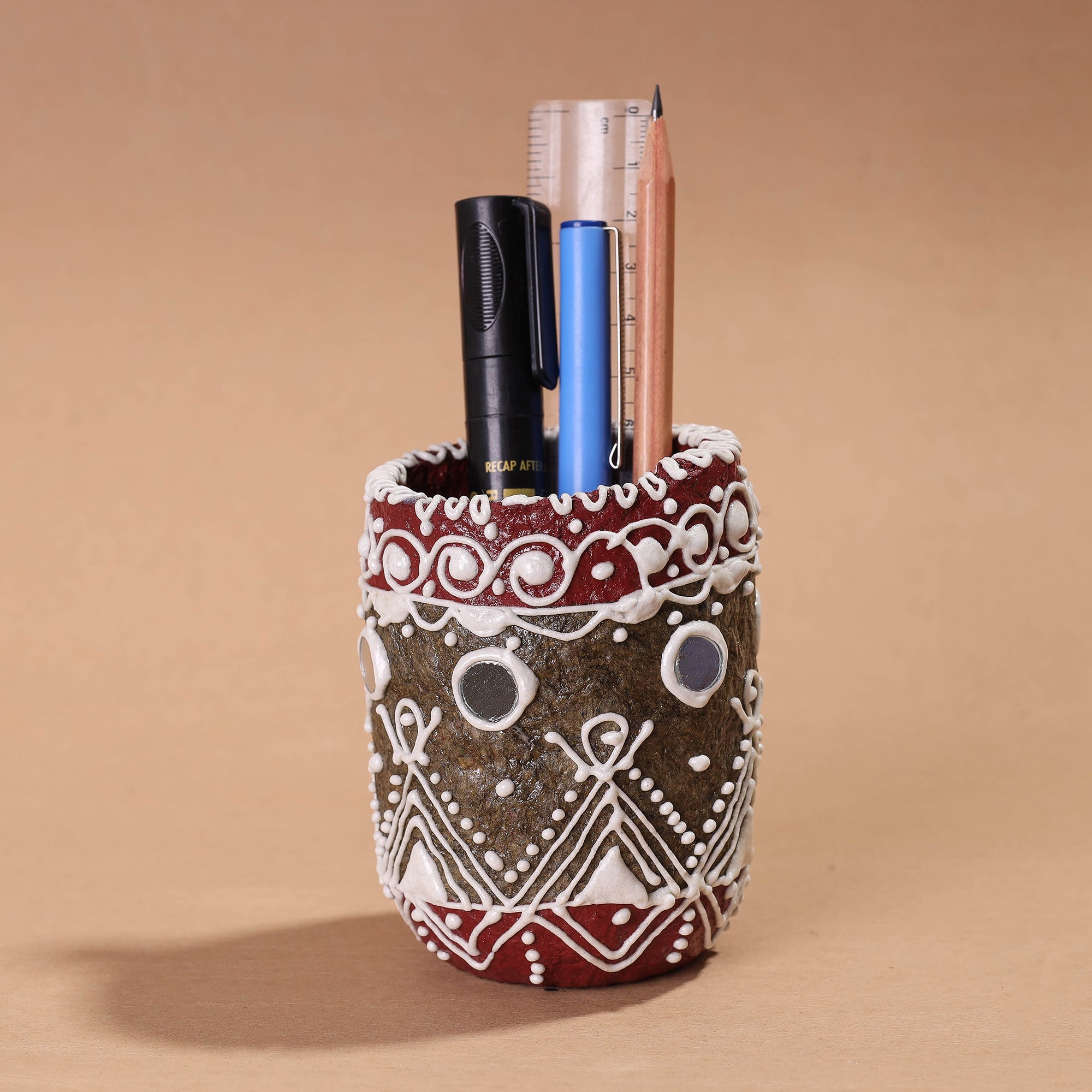Decorative brown mandana art paper mache pen stand handpainted with acrylic colours by master artisan Kaluram Meghvanshi from Rajasthan. This pen stand is made of newspaper or any other waste paper, methi powder and designed using ceramic powder on it. It features intricate Mandana art designs in vibrant colours that truly stand out.
