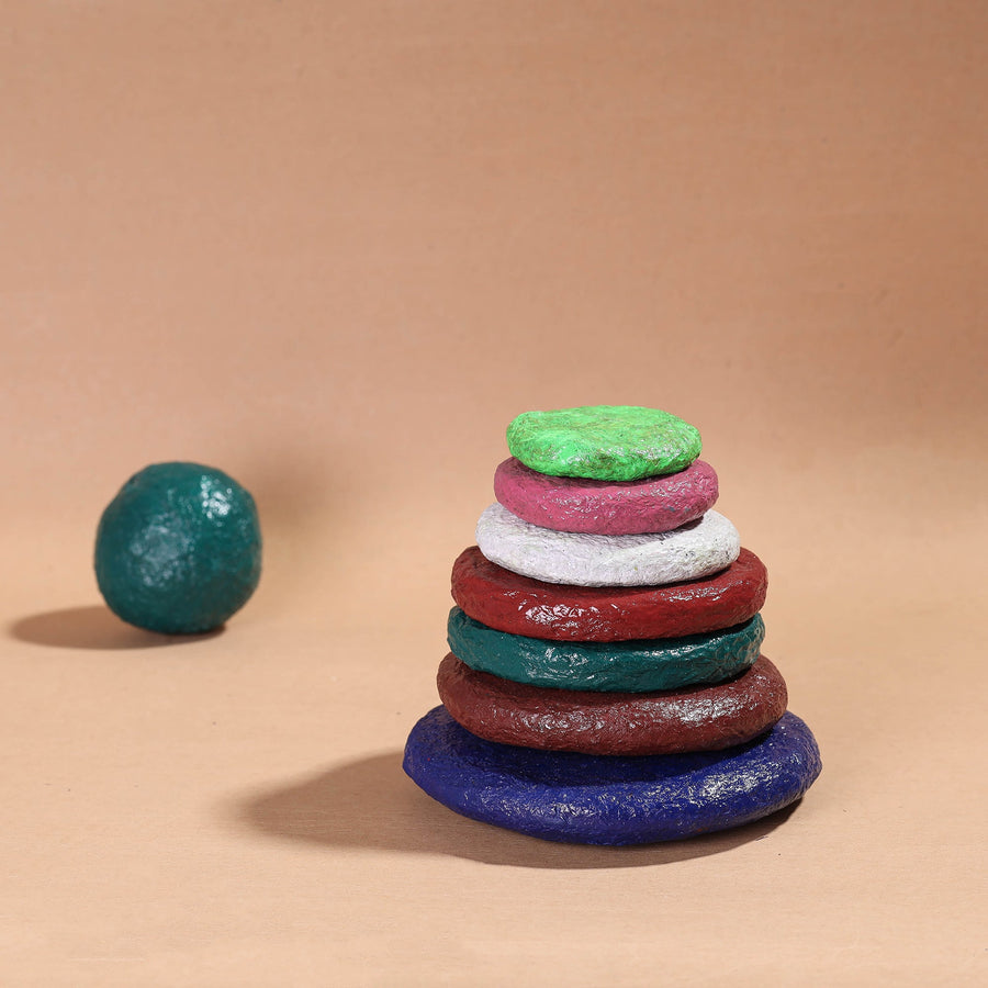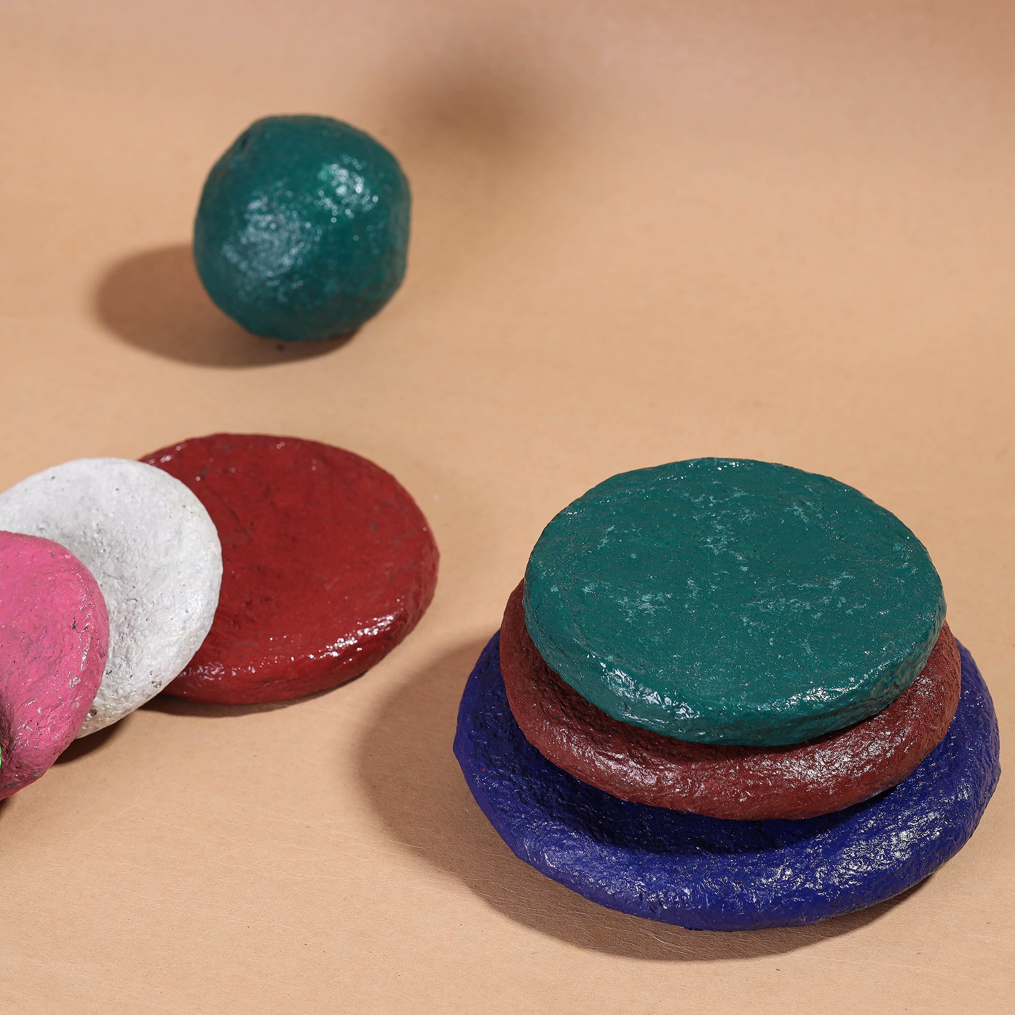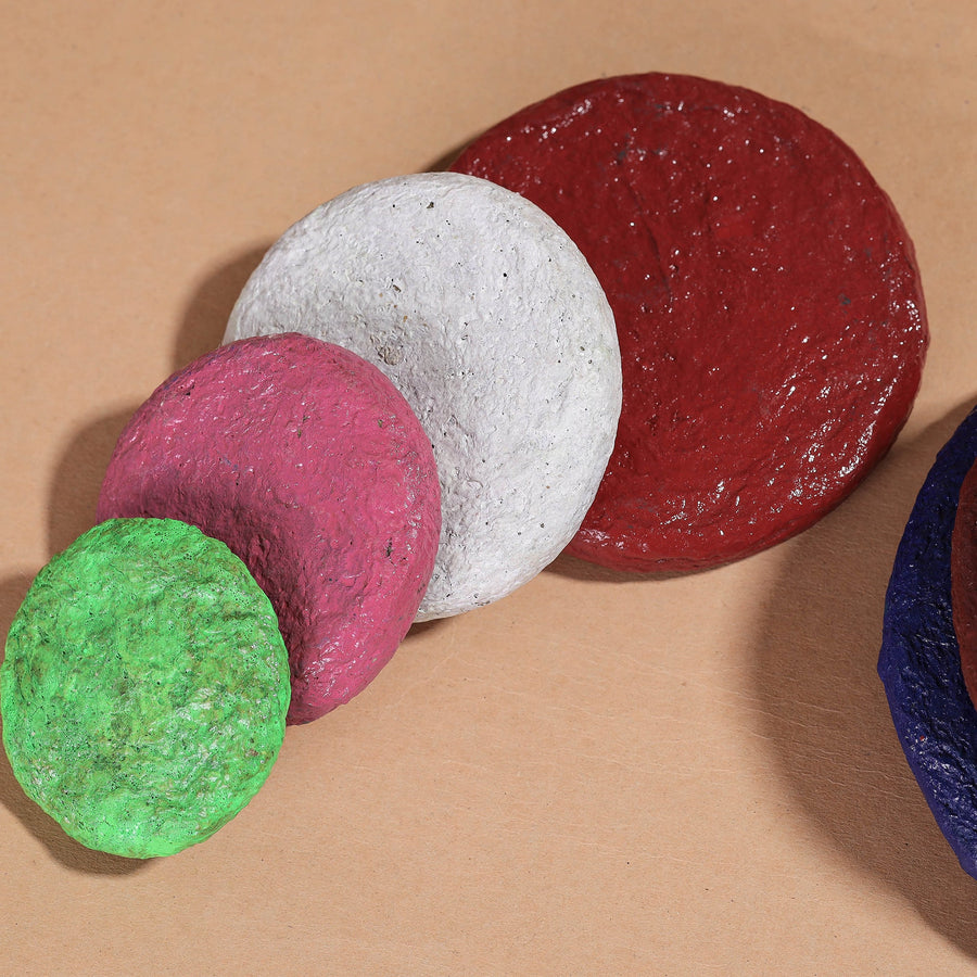 Handpainted Mandana Art with acrylic colours on paper mache pitthu sitoliya by master artisan Kaluram Meghvanshi from Rajasthan. This coasters are made of newspaper or any other waste paper, methi powder, and designed using ceramic powder on it. The Mandana art form is a traditional art style of the Rajasthani region of India, characterized by its use of bold, geometric patterns and bright, eye-catching colors. Each piece is hand-painted by talented artisans, making each one truly unique and one-of-a-kind.