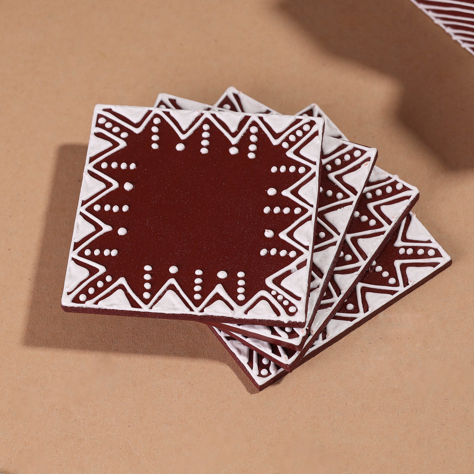 Maroon mandana art paper mache coasters handpainted with acrylic colours by master artisan Kaluram Meghvanshi from Rajasthan. This coasters are made of newspaper or any other waste paper, methi powder, and designed using ceramic powder on it.