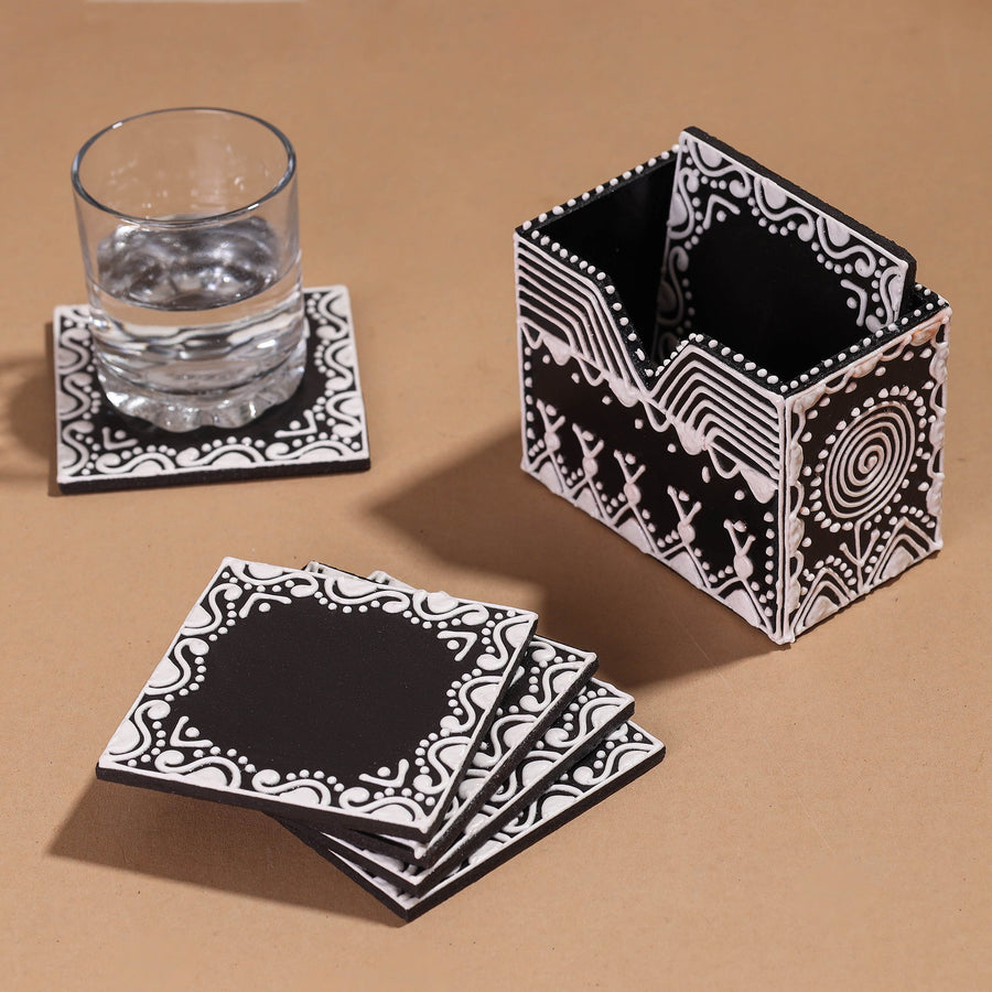 Black mandana art paper mache coasters handpainted with acrylic colours by master artisan Kaluram Meghvanshi from Rajasthan. This coasters are made of newspaper or any other waste paper, methi powder, and designed using ceramic powder on it.