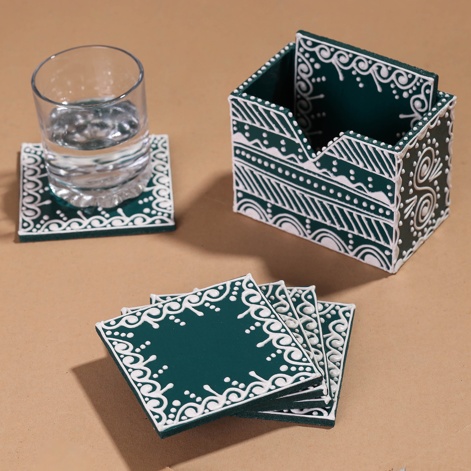 Green mandana art paper mache coasters handpainted with acrylic colours by master artisan Kaluram Meghvanshi from Rajasthan. This coasters are made of newspaper or any other waste paper, methi powder, and designed using ceramic powder on it.