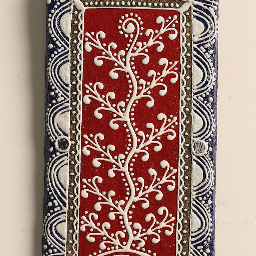 Handpainted Mandana Art with acrylic colours on paper mache decorative wall frame by master artisan Kaluram Meghvanshi from Rajasthan. This decorative item is made of newspaper or any other waste paper, methi powder, and designed using ceramic powder on it. It features intricate Mandana art designs in vibrant colours that truly stand out. The Mandana art form is a traditional art style of the Rajasthani region of India, characterized by its use of bold, geometric patterns and bright, eye-catching colors. Each piece is hand-painted by talented artisans, making each one truly unique and one-of-a-kind.