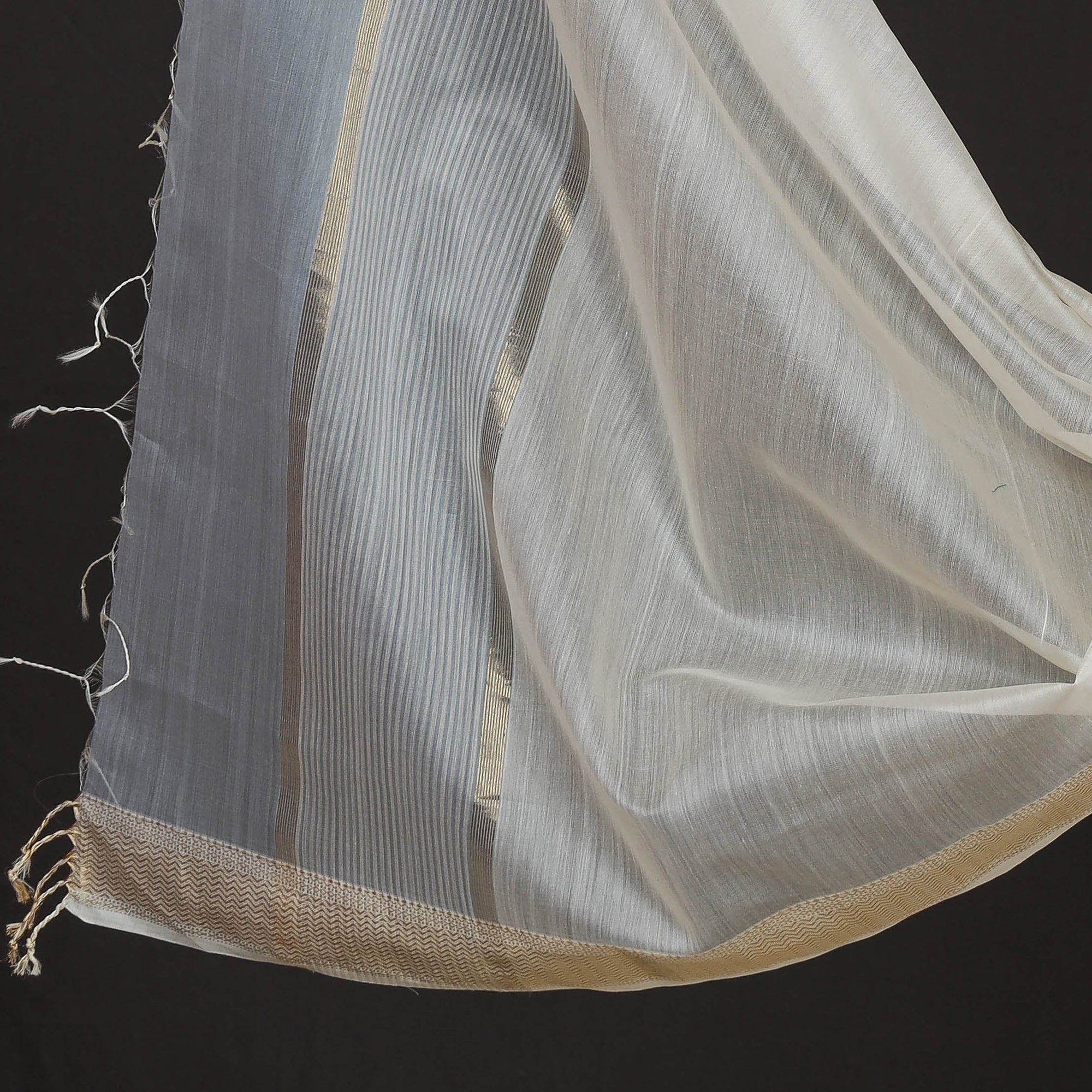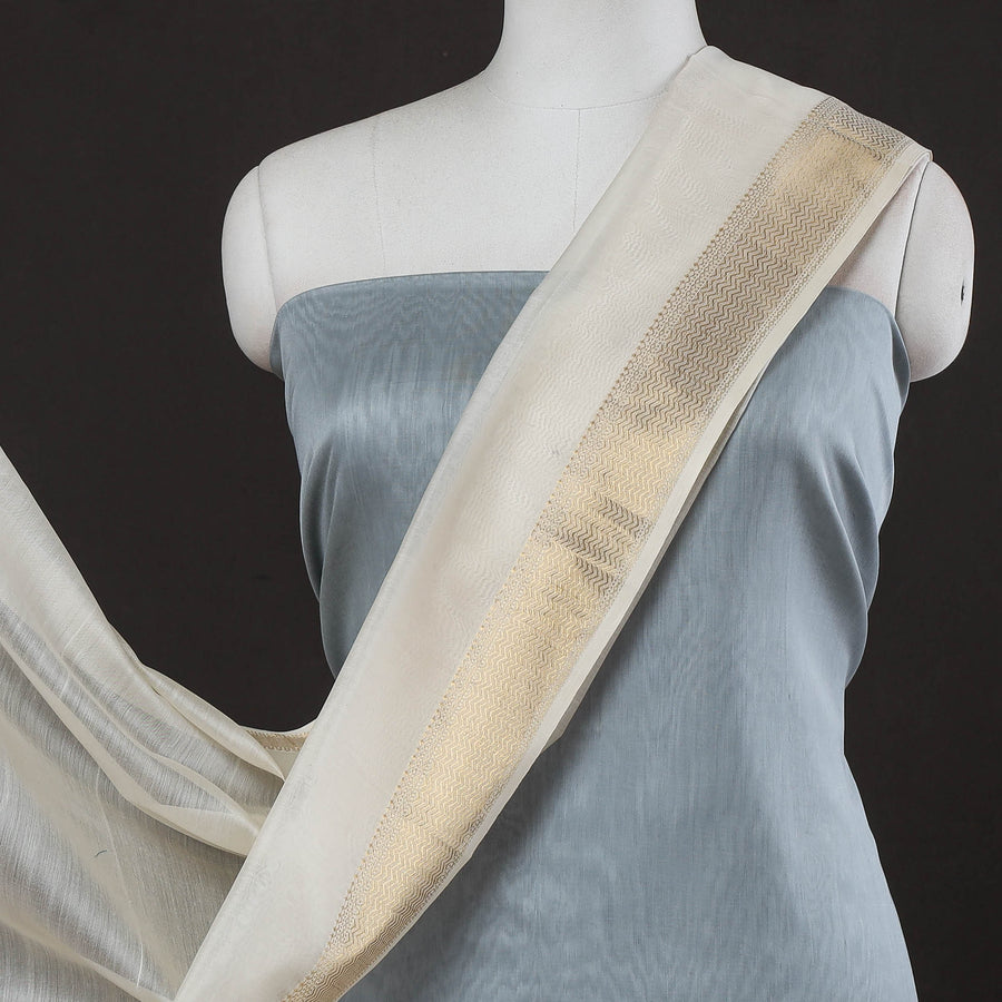 Fine quality traditional maheshwari silk-cotton handloom 2pc suit material set with intricate woven zari work. Its lightweight and sheer texture giving an exquisite grace and elegance of its own. The weaving tradition has been practised in their family for many generations.