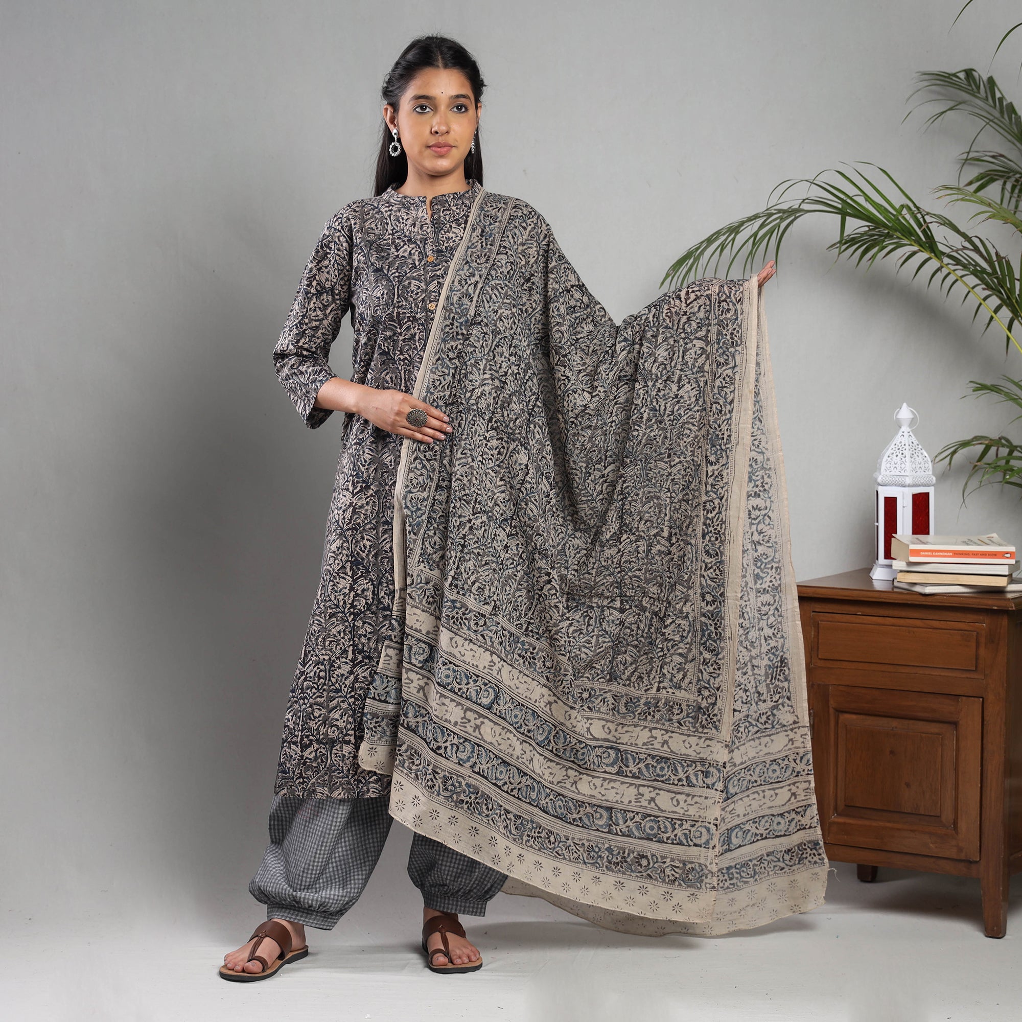 Elevate your style with our exquisite kalamkari block printing cotton long kurta with salwar & dupatta set. This set includes a cotton kurta, dupatta, and plain checks salwar. The kurta features a convenient side pocket for added functionality. Made from fine quality cotton, this suit set ensures comfort all day long. Whether it's for your daily outings or a special occasion, this suit set is perfect for making a statement with its unique design and traditional charm. Step out in confidence and style with this stunning kurta set.