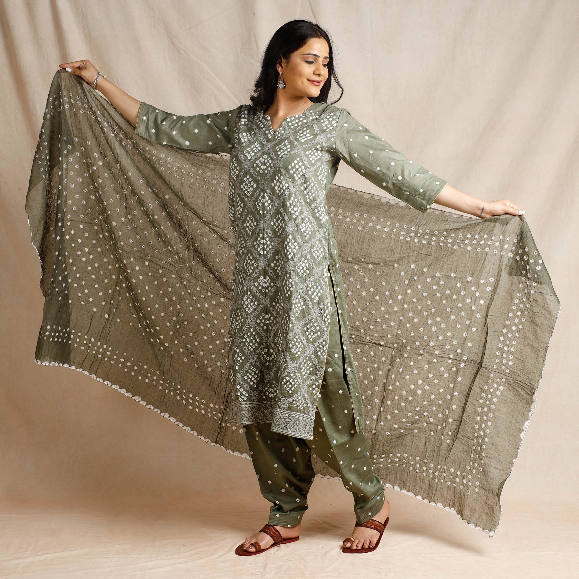 | Material | Elevate your style with this exquisite bandhani long Kurta with salwar & dupatta set. The unique design and intricate handcrafted make this outfit truly special. Made with fine quality cotton, this suit is comfortable to wear all day long. The side pocket adds a convenient touch, and bandhani tie-dye patterns add a touch of elegance. This suit is perfect for your special occasions, showcasing your impeccable taste in fashion. |