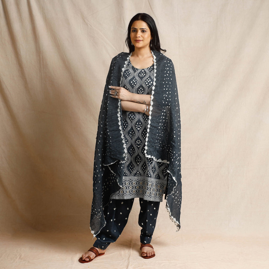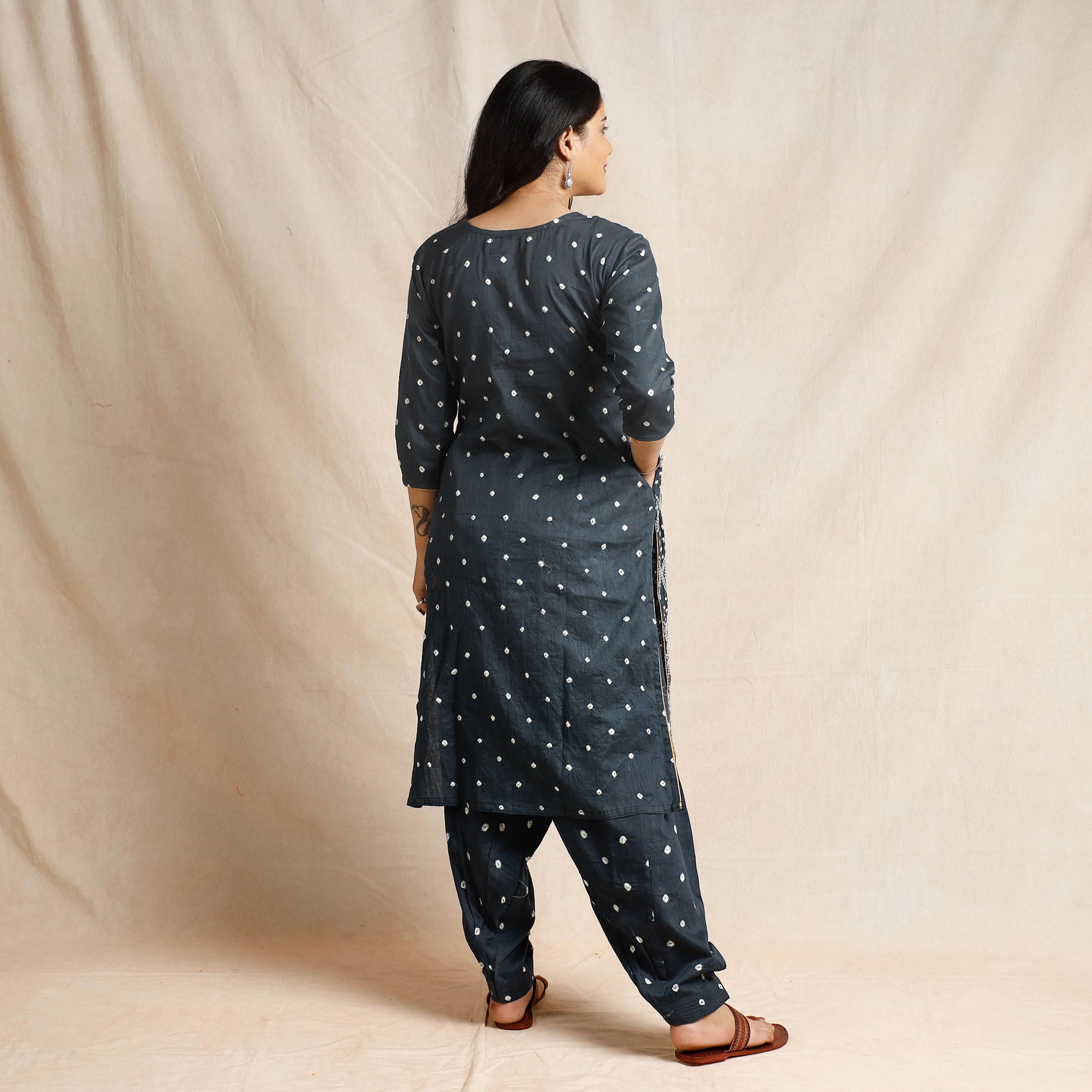 Elevate your style with this exquisite bandhani long Kurta with salwar & dupatta set. The unique design and intricate handcrafted make this outfit truly special. Made with fine quality cotton, this suit is comfortable to wear all day long. The side pocket adds a convenient touch, while the bandhani tie-dye patterns add a touch of elegance. This suit is perfect for your special occasions, showcasing your impeccable taste in fashion.
