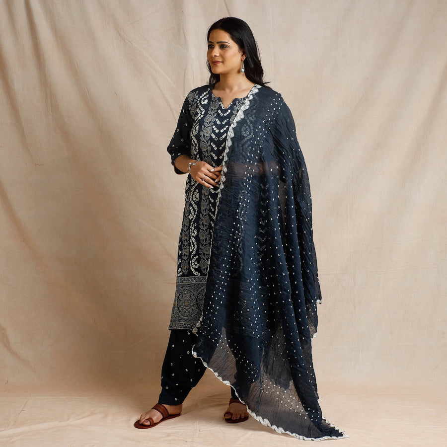 Elevate your style with this exquisite blue bandhani long kurta with salwar & dupatta set. The unique design and intricate handcrafted make this outfit truly special. Made with fine quality cotton, this suit is comfortable to wear all day long. The side pocket adds a convenient touch, while the bandhani tie-dye patterns add a touch of elegance. This suit is perfect for your special occasions, showcasing your impeccable taste in fashion.