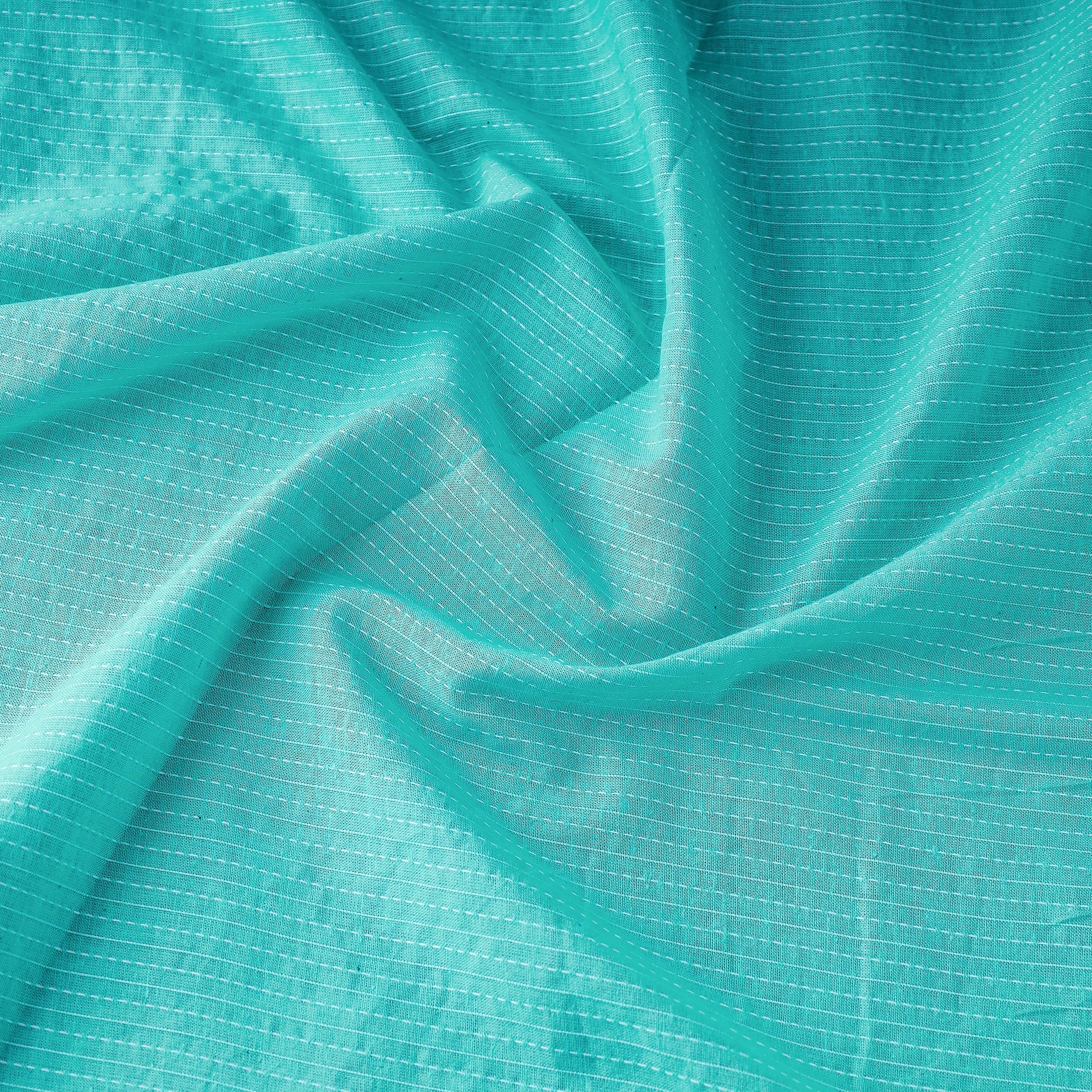 This prewashed running stitch blue cotton fabric is of fine quality and has been dyed a plain color. It was machine made and not created through handmade processes. The fabric originates from Jaipur, Rajasthan, and is ideal for a variety of projects due to its softness and durability.