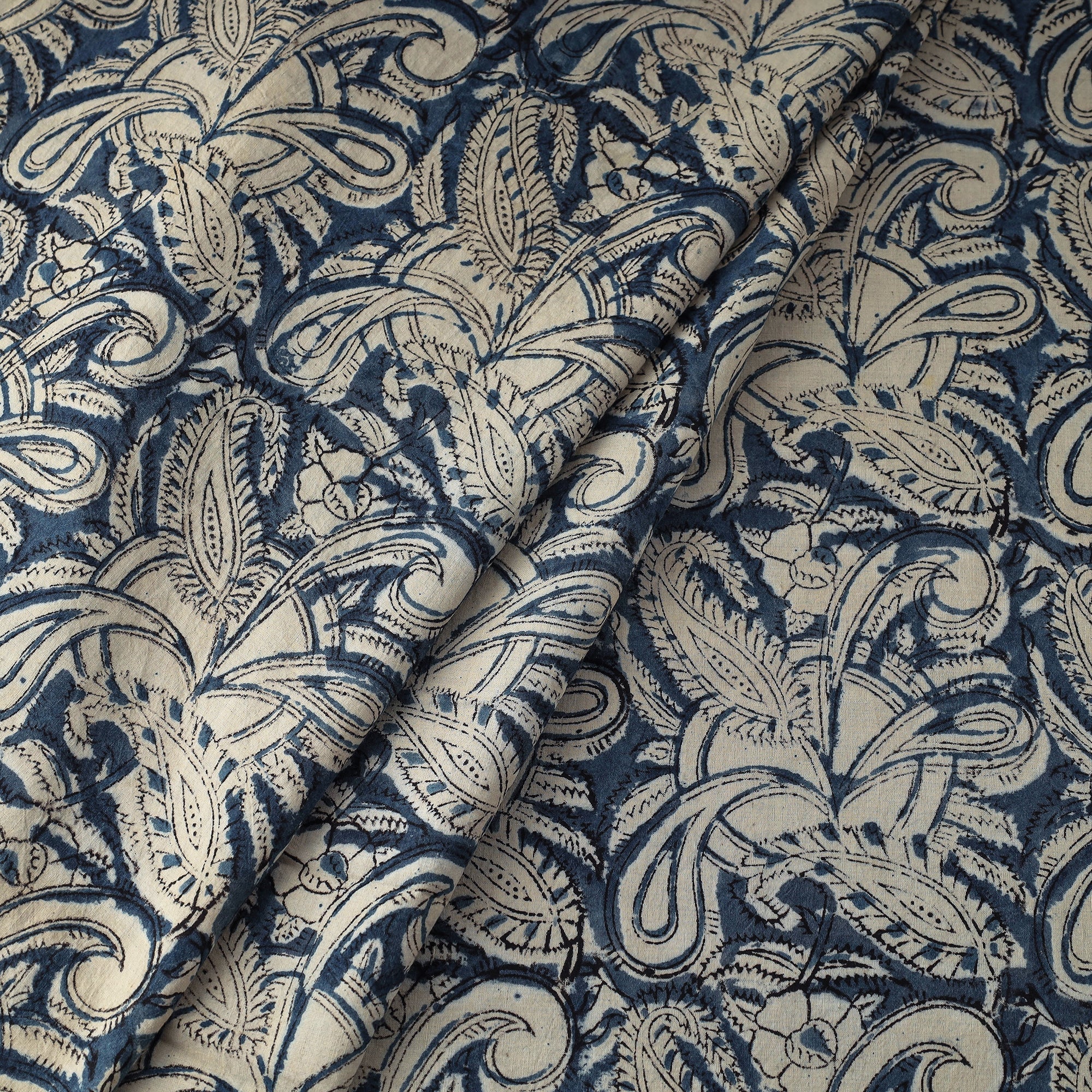 Indulge in the rich artistry of kalamkari with this fine quality blue cotton fabric. Hand block printed using natural dyes, this fabric showcases an array of traditional motifs inspired by Kalamkari painting. The intricate detailing and complex techniques used by artisans from Andhra Pradesh make this fabric a masterpiece. Perfect for creating stunning apparel, home decor, or accessories with a touch of traditional elegance.