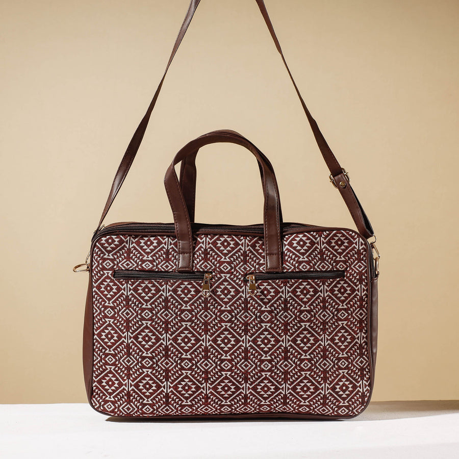 This handcrafted laptop bag is made from woven cotton fabric and rexine sourced from Marudhara, Barmer. It features a detachable and adjustable sling for comfortable carrying, as well as three exterior and one interior zipper pocket for ample storage space. Keep your laptop and other essentials organized and secure in style with this beautiful and practical bag.