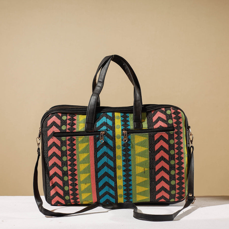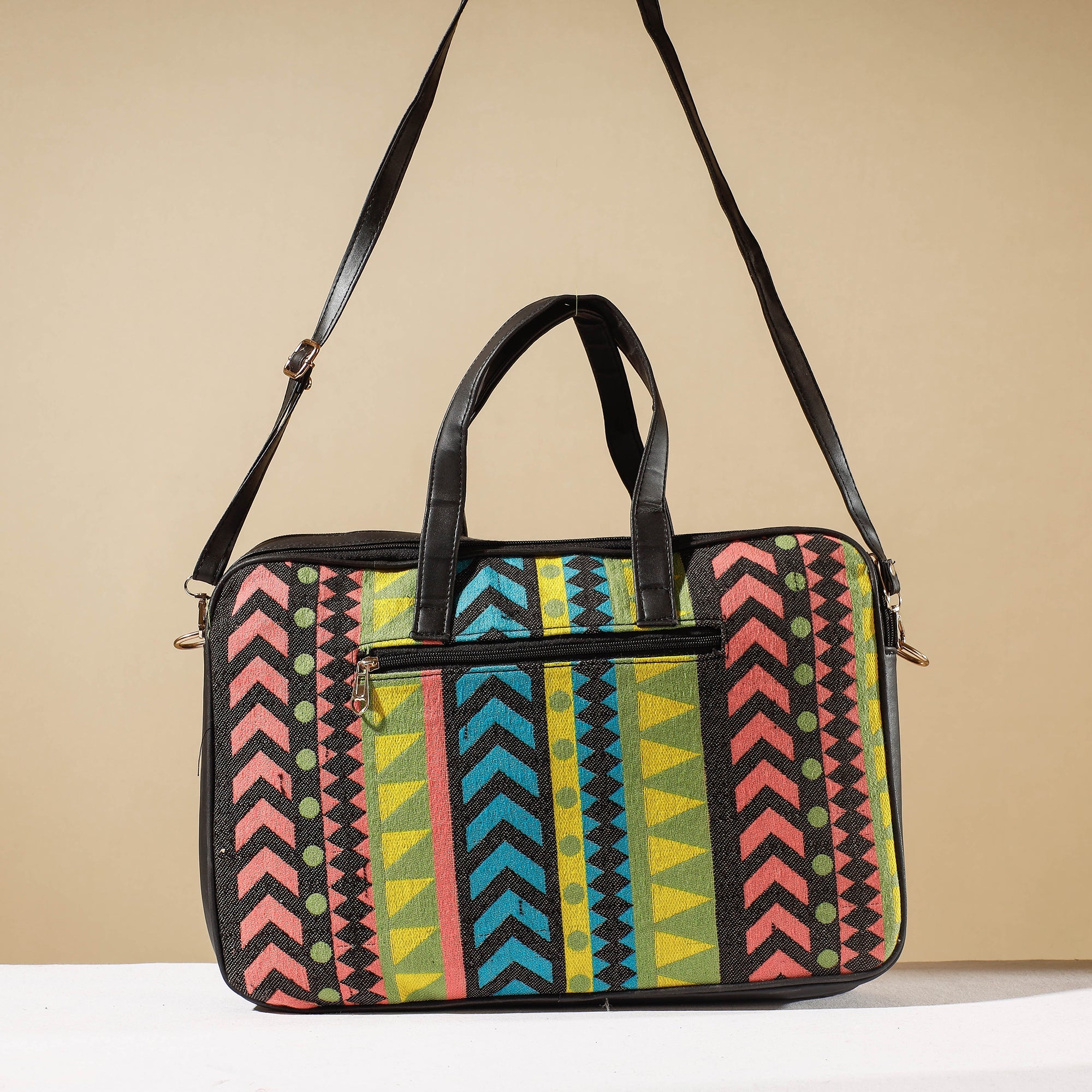 This handcrafted laptop bag is made from woven cotton fabric and rexine sourced from Marudhara, Barmer. It features a detachable and adjustable sling for comfortable carrying, as well as three exterior and one interior zipper pocket for ample storage space. Keep your laptop and other essentials organized and secure in style with this beautiful and practical bag.