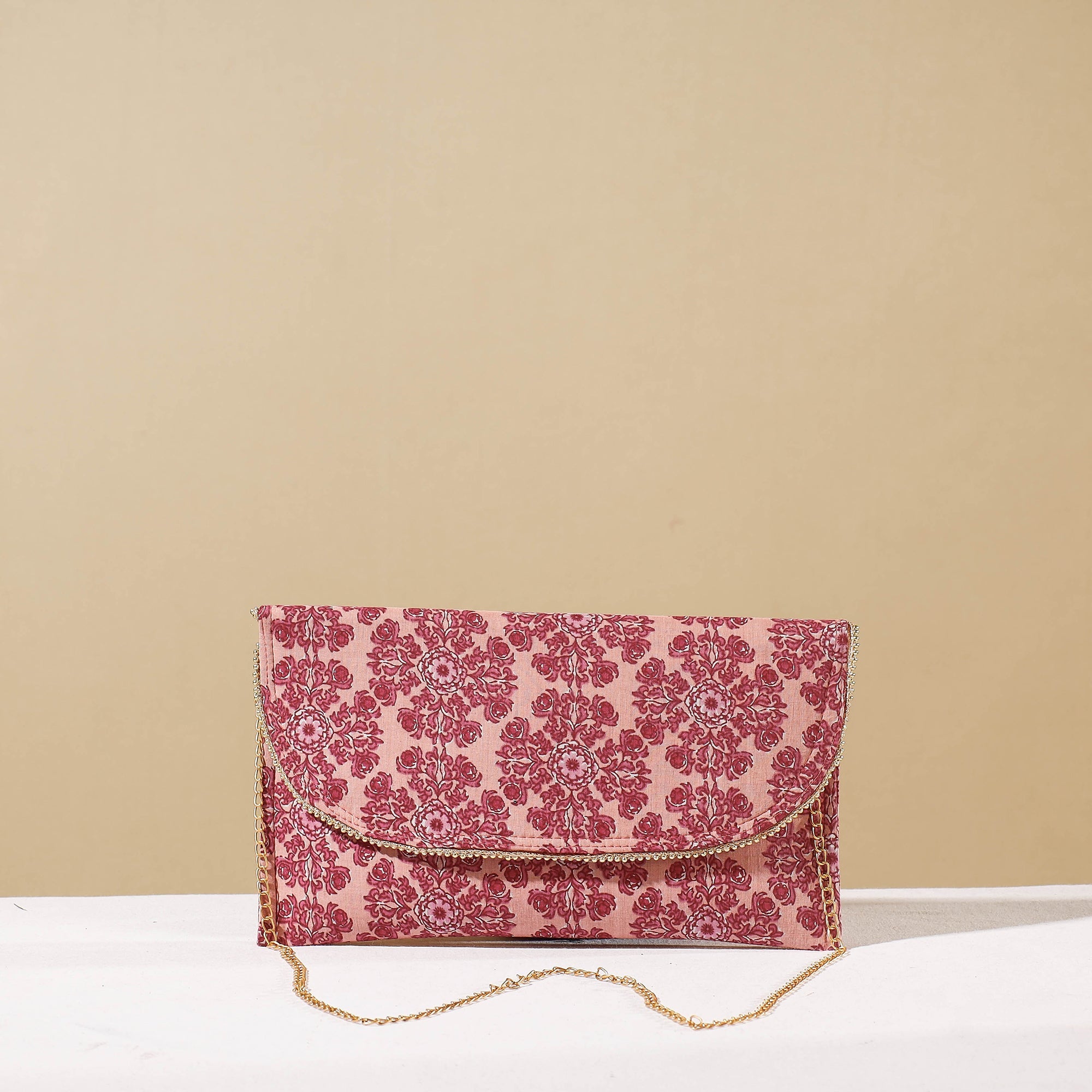 | Material | This beautiful handcrafted sling pink clutch wallet features a detachable sling and is made from hand-block printed cotton fabric sourced from Marudhara, Barmer. It has one interior zipper pocket and offers ample space to carry your essentials in style. Perfect for a night out or a quick run to the store. |
