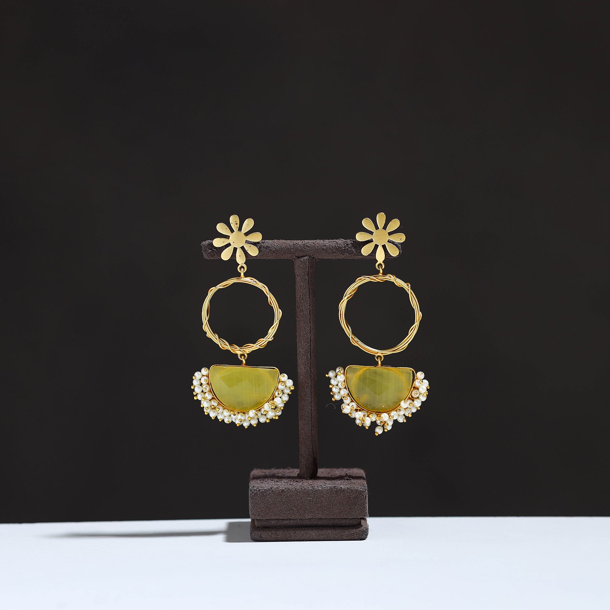 This stunning golden plated seep pearl & onyx natural stone earrings are a masterpiece of craftsmanship, featuring brass with a rustic shine effect and intricate AD-setting Kundan work. Adorned with seep pearls and onyx stones. They are perfect for pairing with sarees, dresses, or everyday ethnic outfits.
