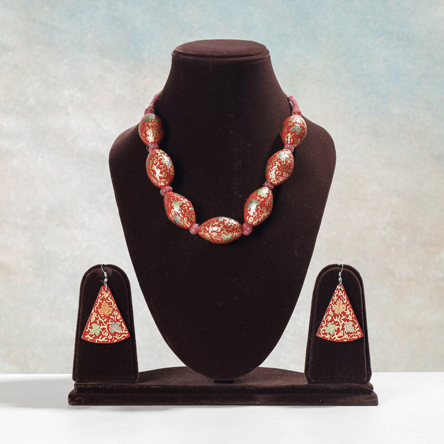 Red handcrafted chinar wooden necklace set, handpainted with varnish coated acrylic colors.