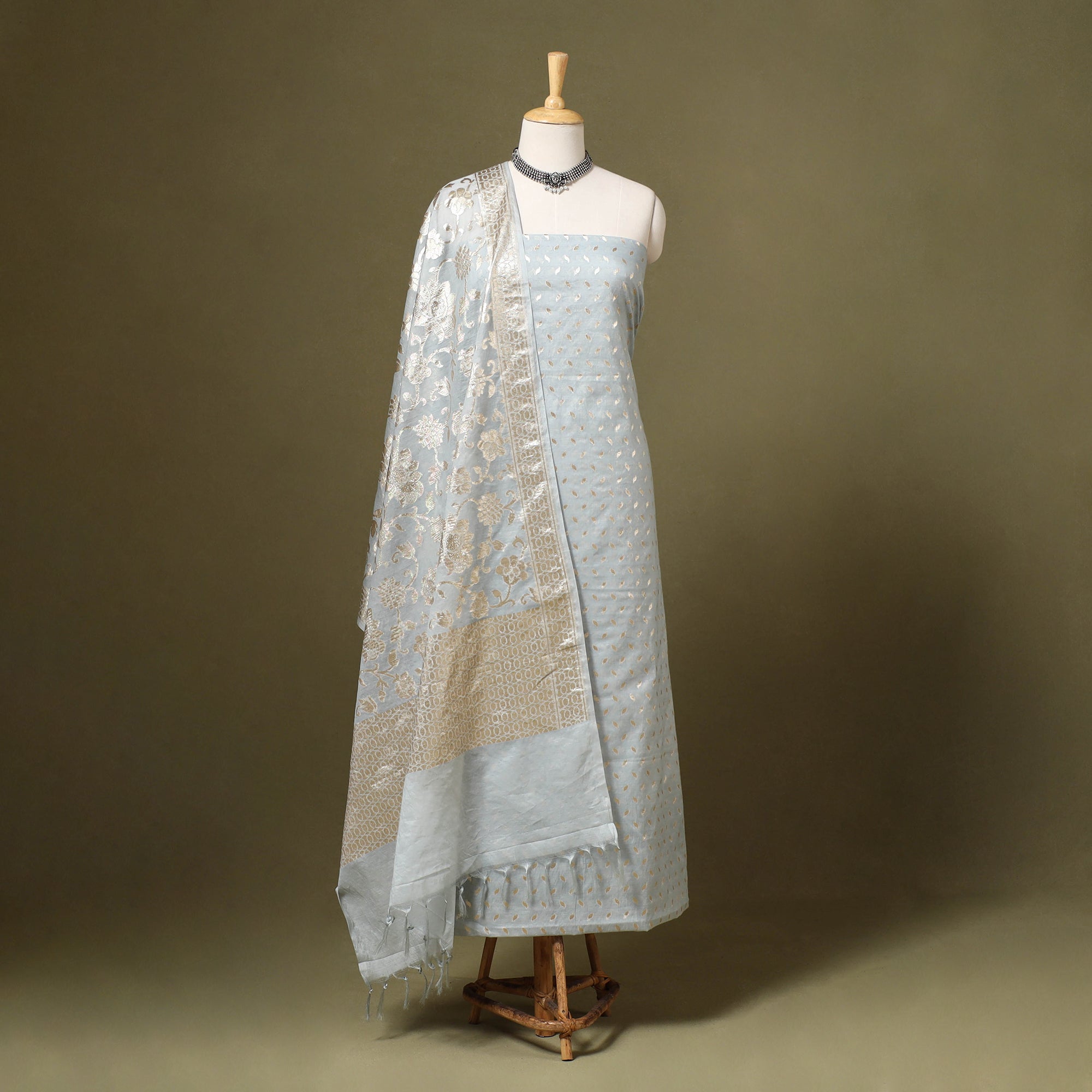 Banarasi buta cotton x viscose 2pc suit material set with brocade zari border dupatta. This collection of finest pure handloom silk suit sets from Banaras are going to be a beautiful addition to your wardrobe in vibrant jewel tones the suit material have intricately woven motifs in silk, with gold zari accents.