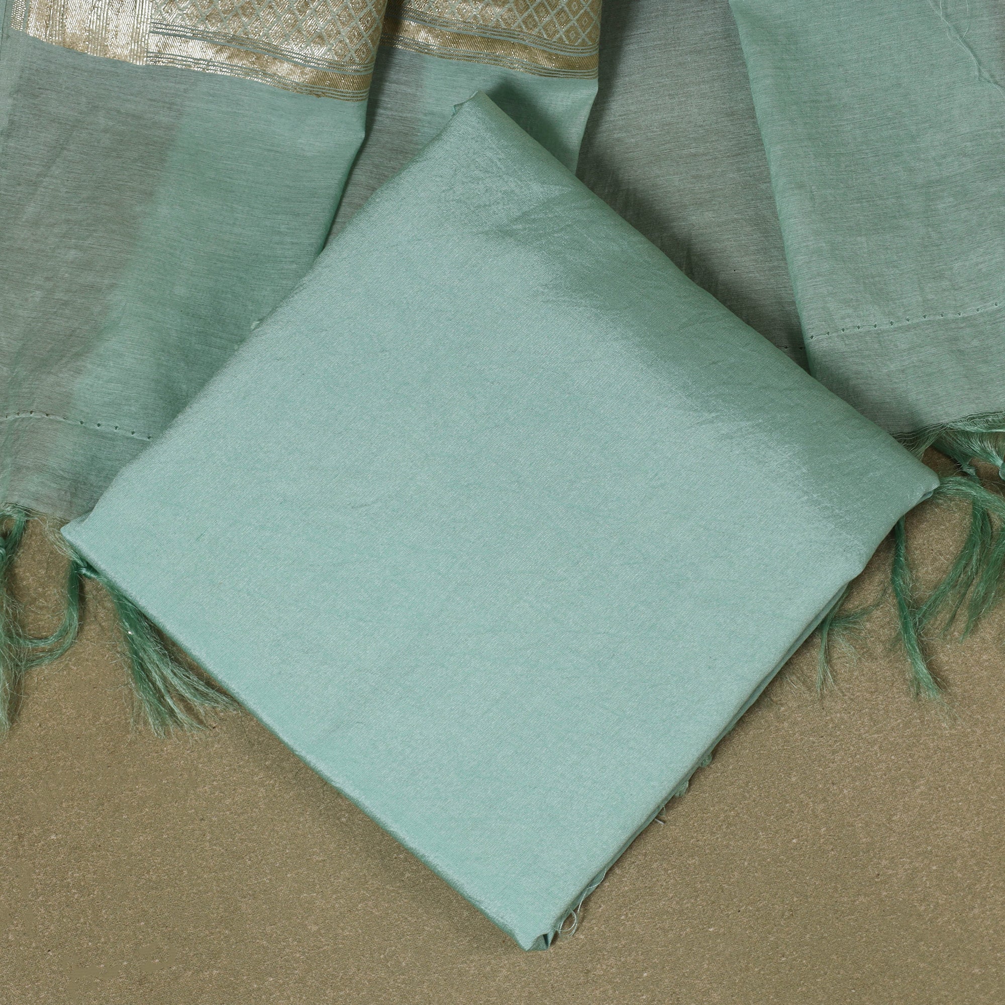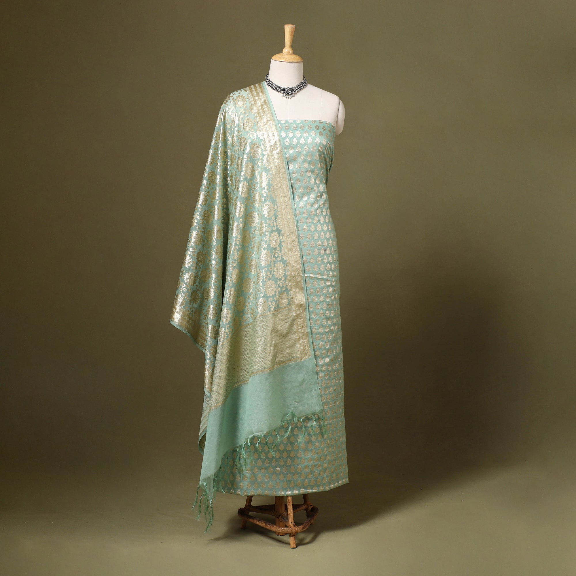 Banarasi buta cotton x viscose 2pc suit material set with brocade zari border dupatta. This collection of finest pure handloom silk suit sets from Banaras are going to be a beautiful addition to your wardrobe in vibrant jewel tones the suit material have intricately woven motifs in silk, with gold zari accents.