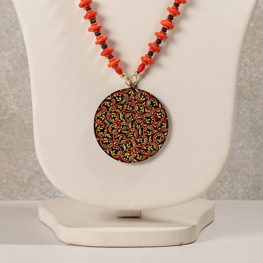 Orange handpainted miniature painting pine wood (MDF) necklace with beads by Rajesh & Monali. Acrylic colours used.