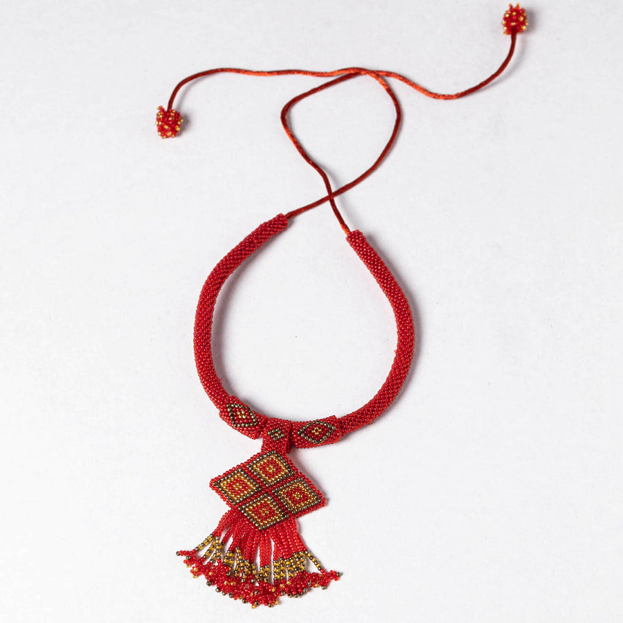 Intricately crafted red beadwork necklace handmade using glass beads with silk-cotton yarn in vibrant colours by Pushpa Harit from Neemuch, Madhya Pradesh.