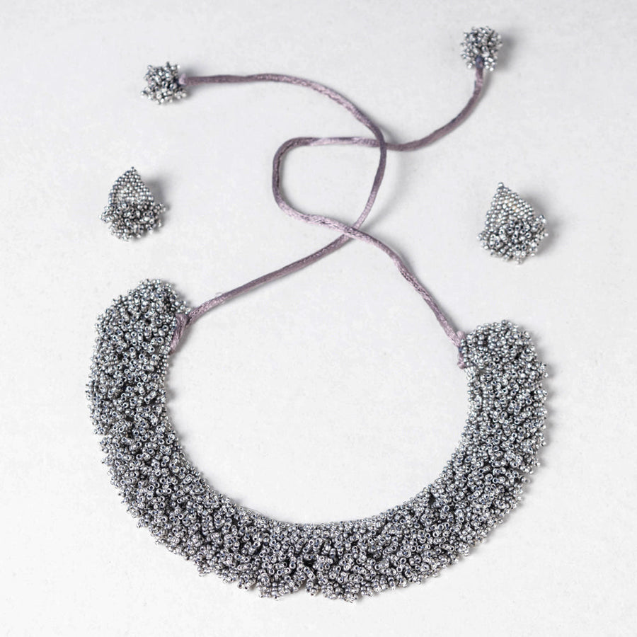 Intricately crafted handmade beadwork jali necklace set using glass & ceramic beads with silk-cotton yarn by Pushpa Harit from Neemuch, Madhya Pradesh. Exclusive beadwork jewelry in vibrant colours for a versatile appeal.